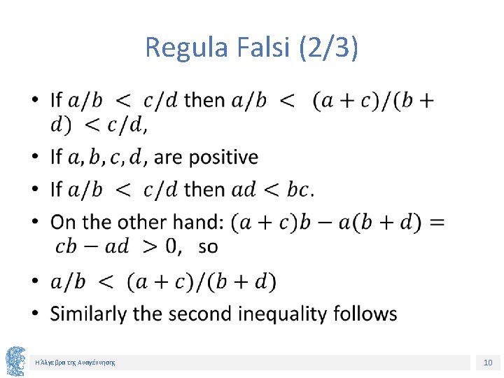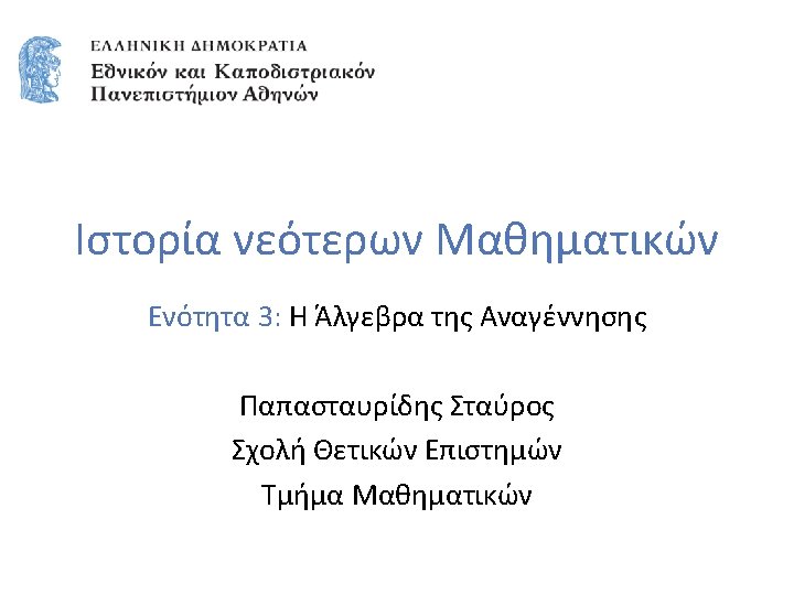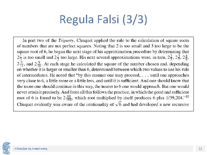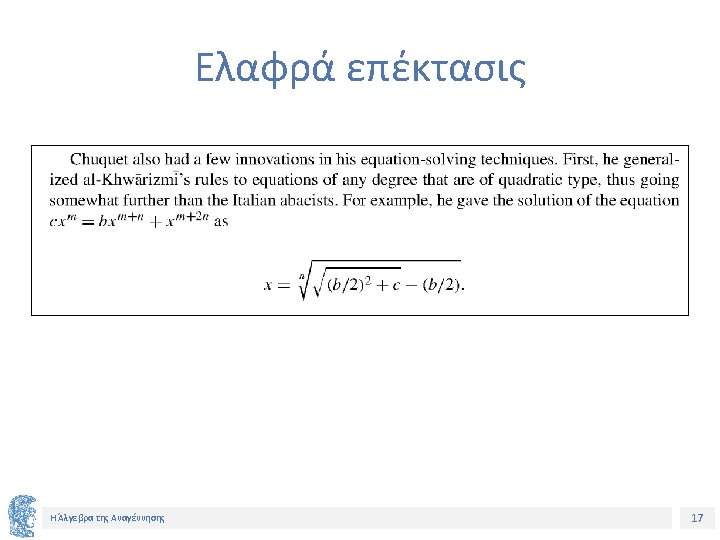 Greek Dichotomy (1/2) • KATZ. 12. 2. 1 France: Nicolas Chuquet, p. 391 • Algorithm to calculate it to whatever accuracy may be desired. He had therefore taken another step on the road to denying the usefulness of the Greek dichotomy between the discrete and the continuous, the final elimination of which was to occur about a century later. • Σχόλιο: Greek Dichotomy? Η Άλγεβρα της Αναγέννησης 12