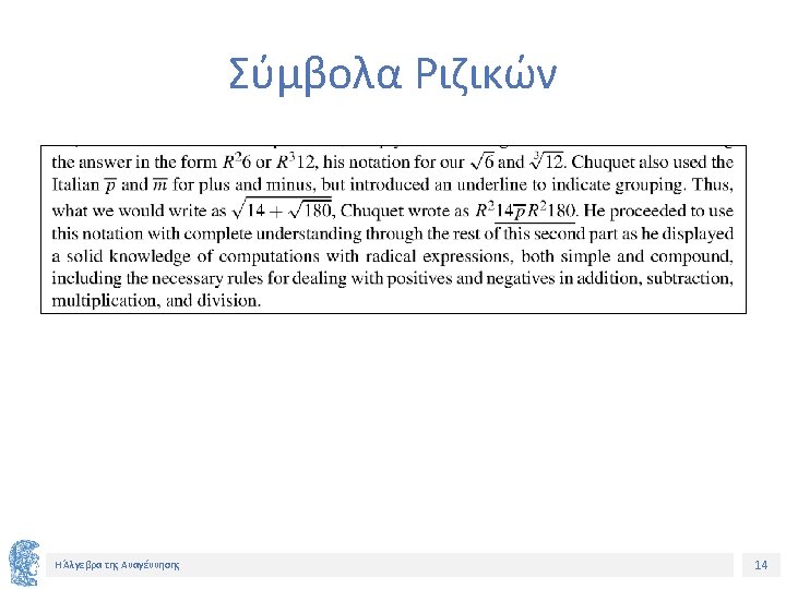 Greek Dichotomy (2/2) • The continuous, the final elimination of which was to occur about a century later. • Chuquet also displayed in the second part of his work the standard methods for calculating the square and cube roots of larger integers, one integral place at a time, but as is usual in the discussion of these methods, he did not take the method below the unit. • He showed no knowledge of the idea of a decimal fraction. If the standard method did not give an exact root, one could choose between calculating using common fractions by his method of intermediates or (and this is the method he preferred) simply not bothering to calculate at all and leaving. Η Άλγεβρα της Αναγέννησης 13