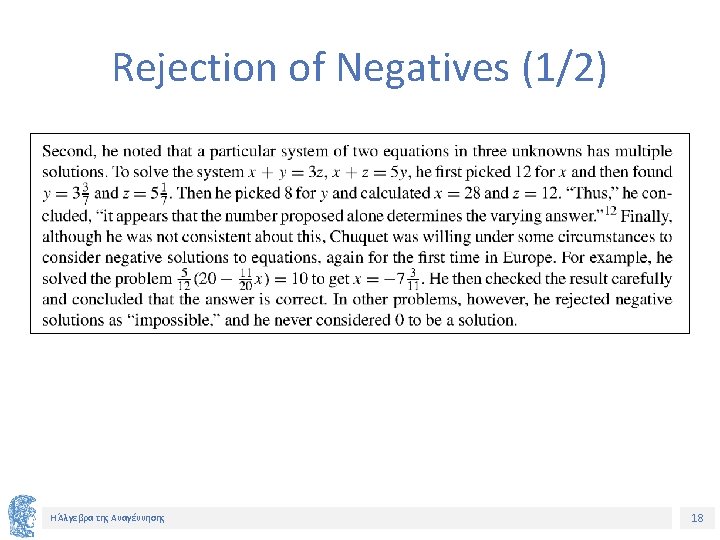 Rejection of Negatives (2/2) • The three supplements to the Triparty contained hundreds of problems in which the techniques of that work were applied. • Many of the problems were commercial, of the same type found in the Italian abacus works, while others were geometrical, both practical and theoretical. • This work may have been intended as a text, although probably not in a university, but, unfortunately, the Triparty was never printed and exists today only in manuscript form. • Some parts of it were incorporated into a work of Estienne de la Roche (probably one of Chuquet’s students) in 1520, but neither this work nor Chuquet’s itself had much influence. • Σχόλιο: Βαθμιαία Πρόοδος Η Άλγεβρα της Αναγέννησης 19