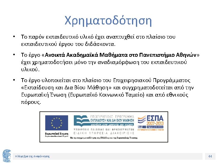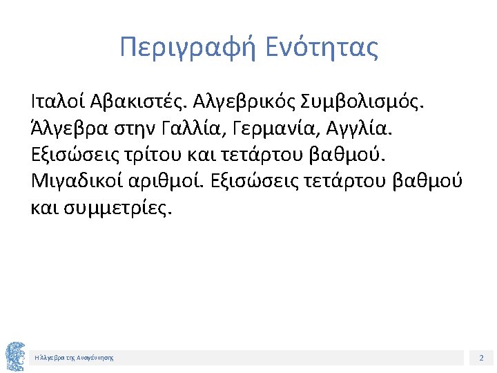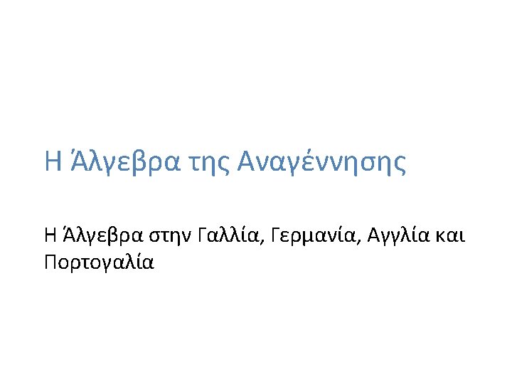 Εισαγωγή (2/2) • But each of them also seems to have some original material. It appears that the knowledge of Islamic algebra had spread widely in Europe by the fifteenth century. • Each person attempting to write new works used this material and works in algebra from elsewhere in Europe, adapted them to fit the circumstances of his own country, and introduced some of his own new ideas. • By the late sixteenth century, with the spread of printing, new ideas could circulate more rapidly throughout the continent, and those generally felt to be most important were absorbed into a new European algebra. Η Άλγεβρα της Αναγέννησης 6
