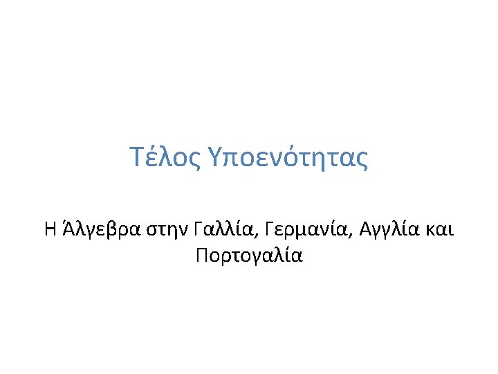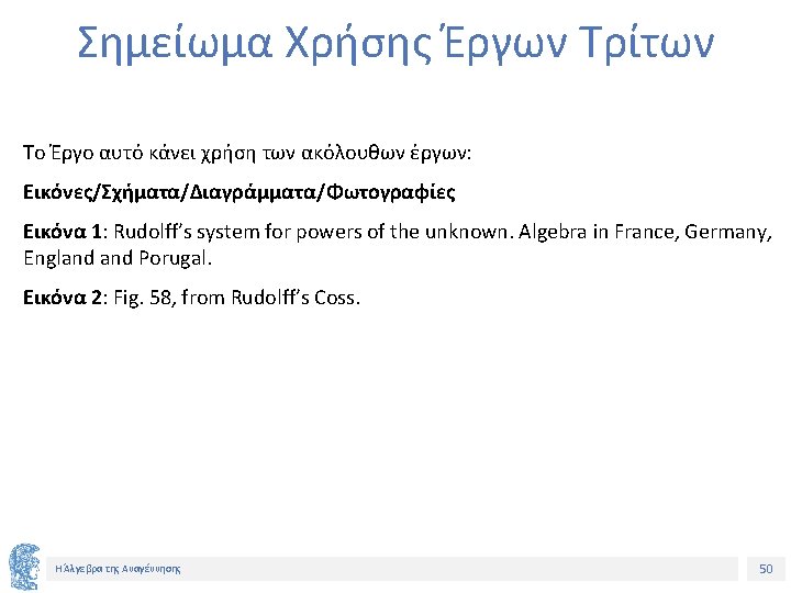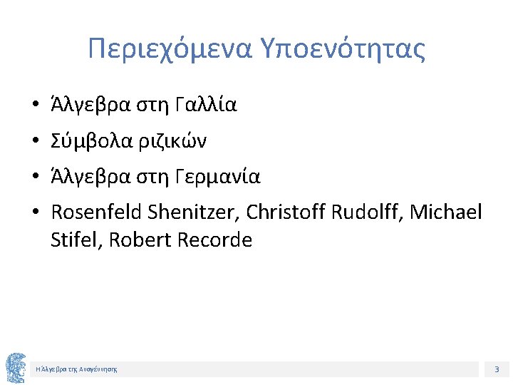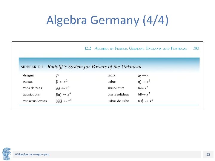 Algebra Germany (3/4) • In a section dealing with progressions, Rudolff included a list of nonnegative powers of 2 alongside their respective exponents, just as Chuquet had done. He also noted that multiplication in the powers corresponded to addition in the exponents. He then extended this idea to powers of the unknown, again as Chuquet had done. • Although Rudolff did not have the exponential notation of his French predecessor, he did have a system of abbreviations of the names of these powers, where his naming scheme was similar to the Italian multiplicative one (Sidebar 12. 1). Η Άλγεβρα της Αναγέννησης 22