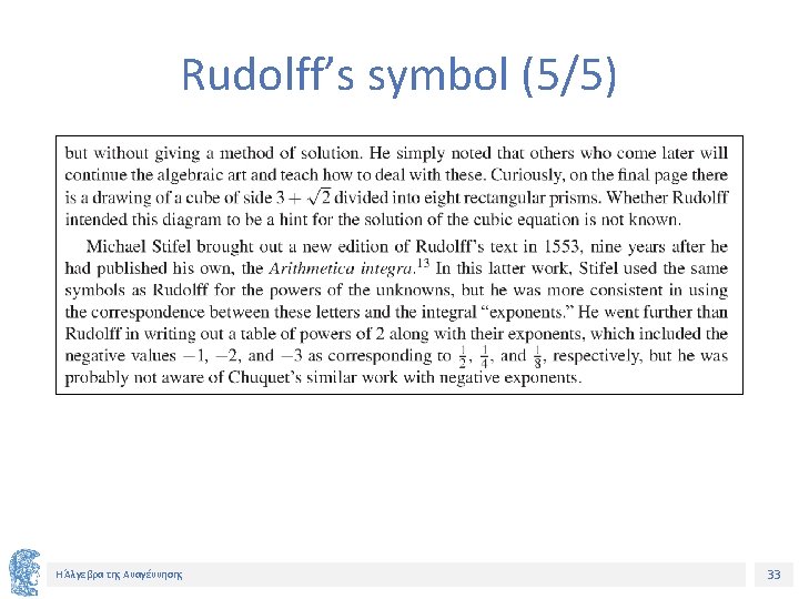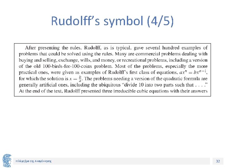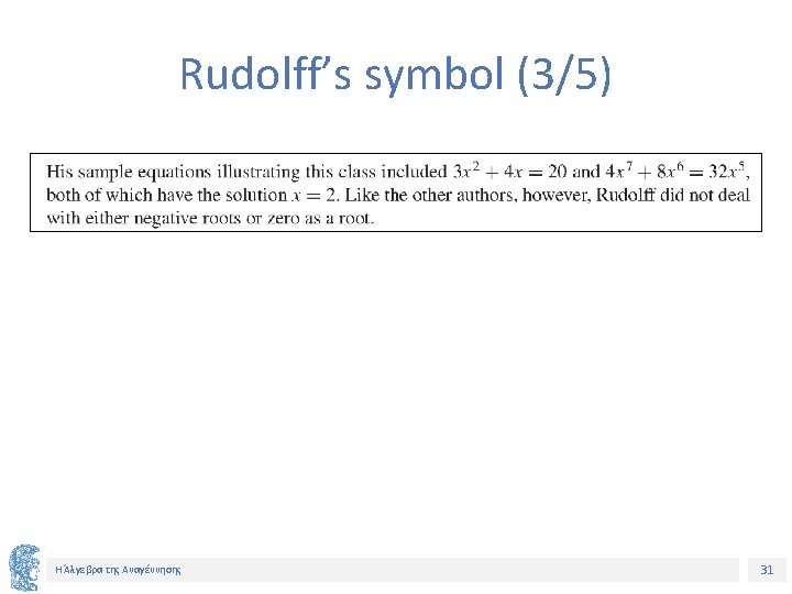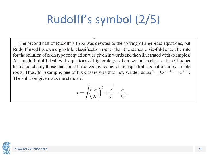 Rudolff’s symbol (1/5) • 1489. There, however, they represented excess and deficiency rather than operations. Rudolff also introduced in his Coss the modern symbol √ for square root. • He modified this symbol somewhat to indicate cube roots and fourth roots but did not use modern indices. He did, however, give a detailed treatment of operations on surds, showing how to use conjugates in division as well as how to find the square roots of surd expressions such as 27 + √ 200. • He also introduced a symbol for “equals, ” namely, a period, as in 1. 2 (x = 2). Often, however, he relied on the German gleich. Η Άλγεβρα της Αναγέννησης 29