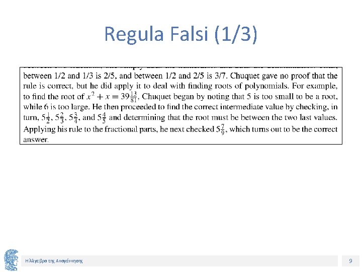 Algebra in France, Nicolas Chuquet (c. 1450 -c. 1494) (2/2) • The first part of the Triparty is concerned with arithmetic. Like the Italian works, it began with a treatment of the Hindu-Arabic place value system and detailed the various algorithms for the basic operations of arithmetic, both with whole numbers and with fractions. • One of Chuquet’s procedures with fractions was a rule “to find as many numbers intermediate between two neighboring numbers as one desires. ” His idea was that to find a fraction between two fractions, one simply adds the numerators and adds the denominators. Η Άλγεβρα της Αναγέννησης 8