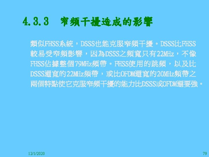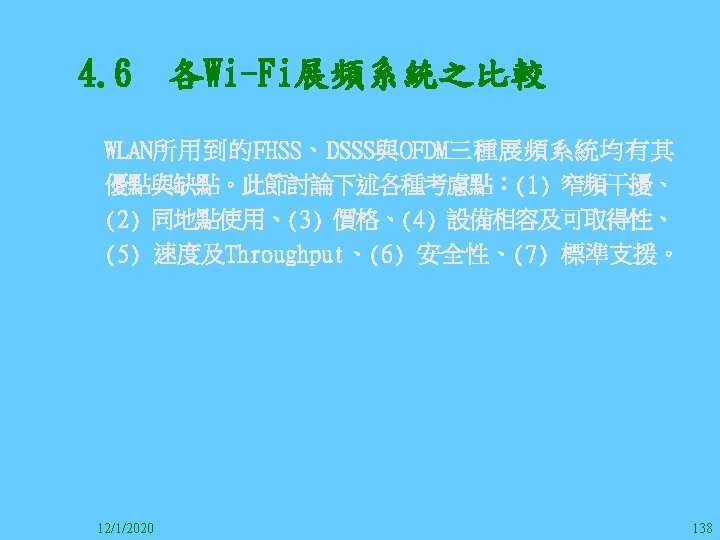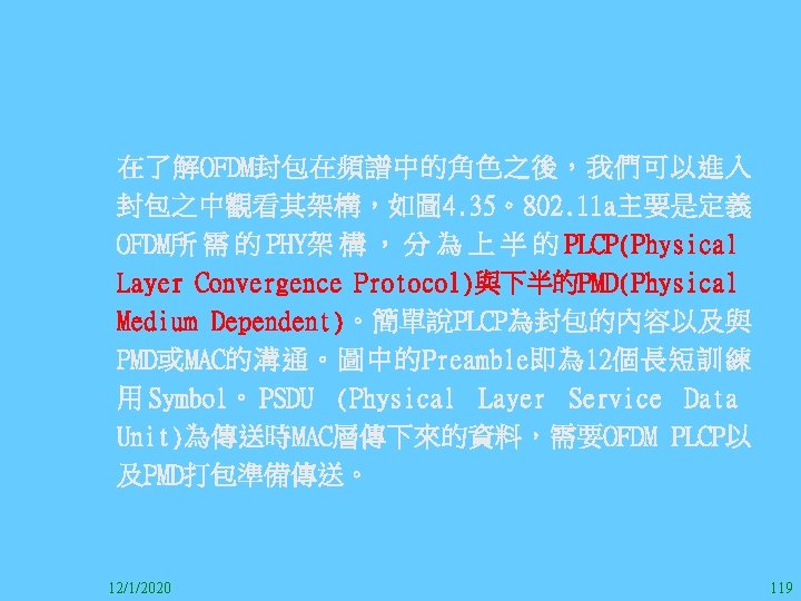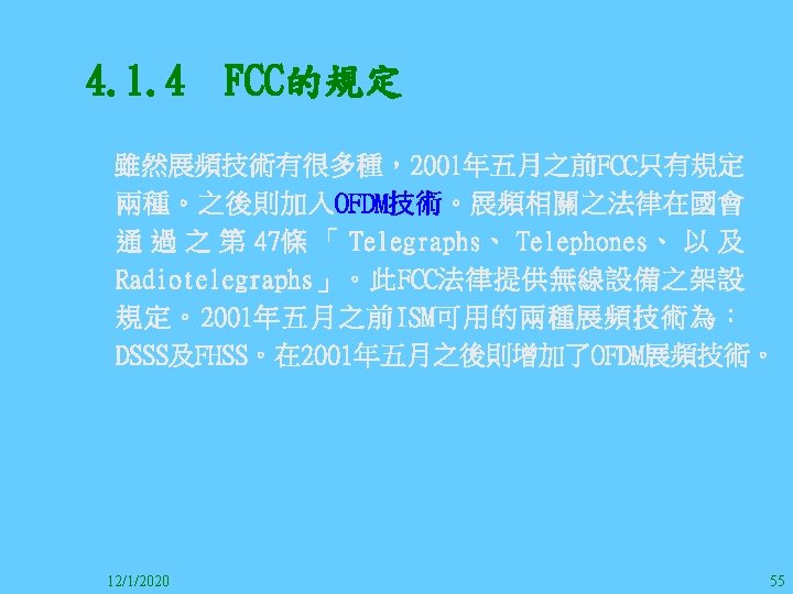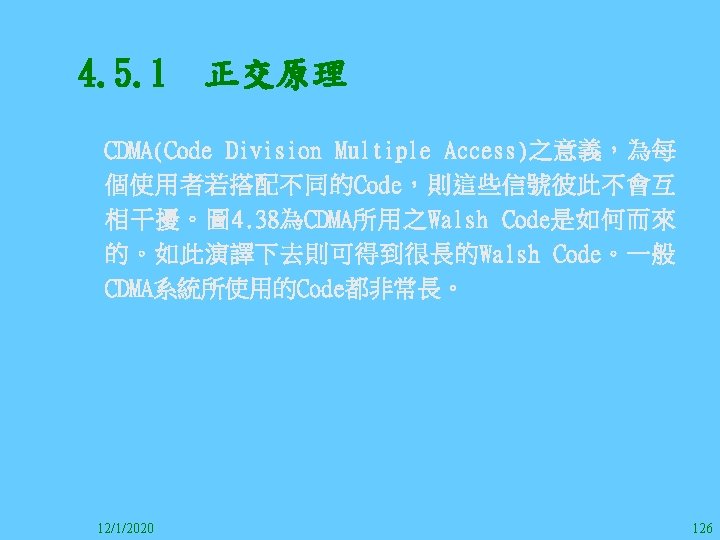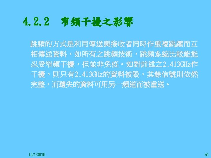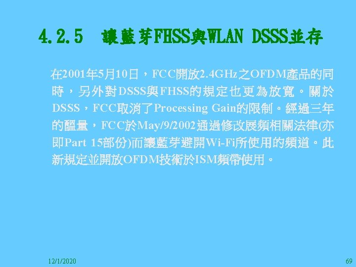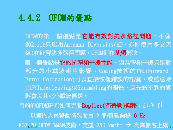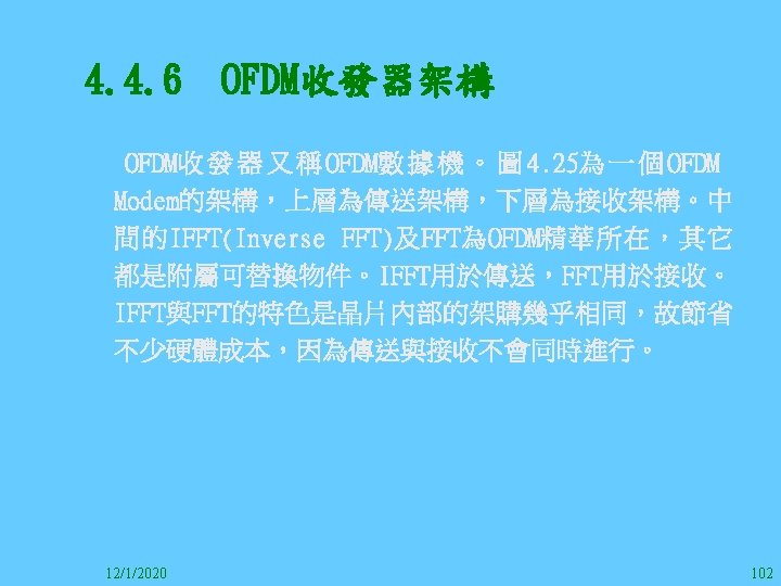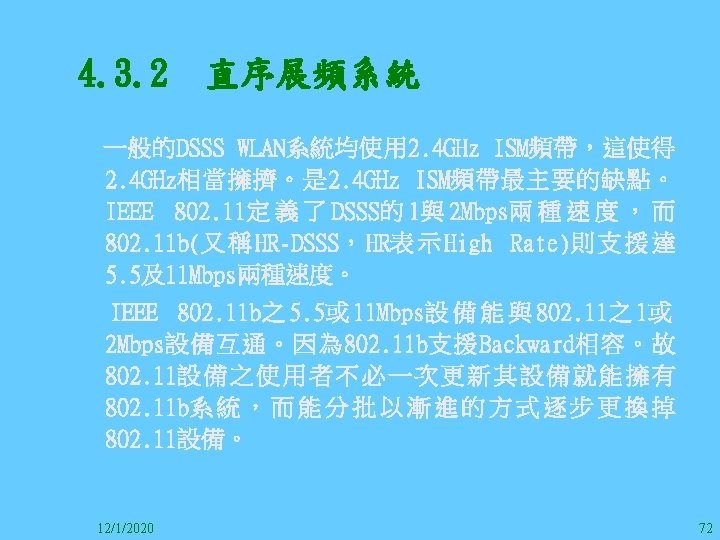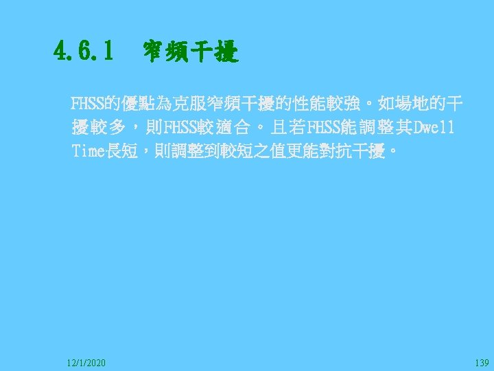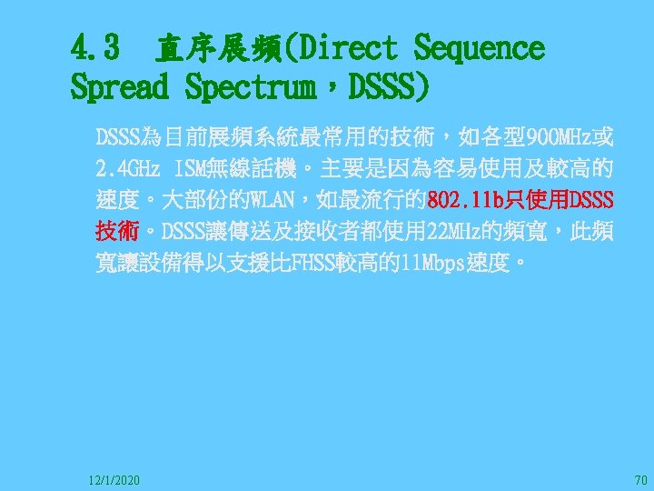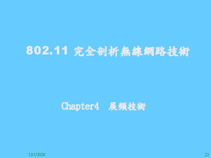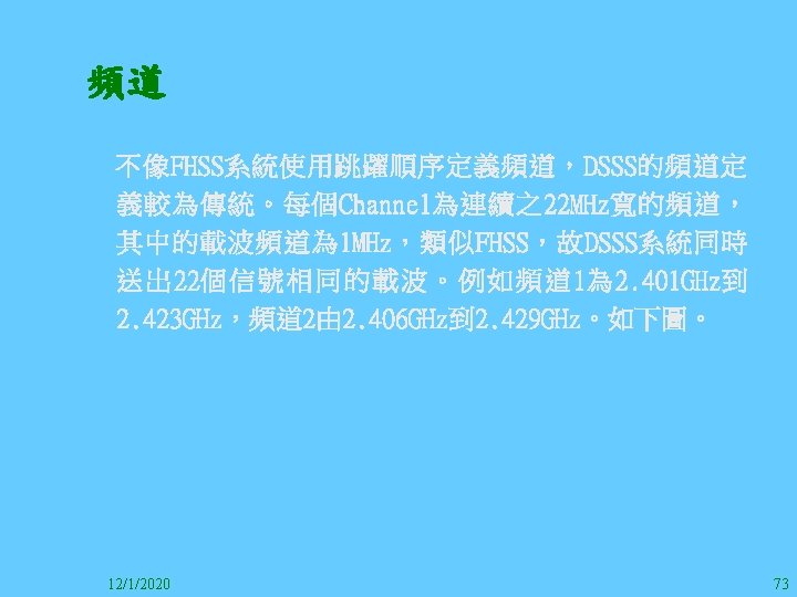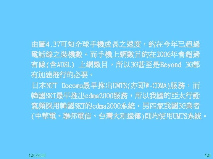 1212020 2 1212020 3 1212020 4 1212020 5 Slides: 147 Download presentation 12/1/2020 2 12/1/2020 3 12/1/2020 4 12/1/2020 5 12/1/2020 6 12/1/2020 7 12/1/2020 8 12/1/2020 9 12/1/2020 10 12/1/2020 11 IEEE 802系列的網路協定 12/1/2020 13 12/1/2020 25 12/1/2020 27 12/1/2020 30 在WLAN之外,WPAN (Wireless Personal Area Network)、WMAN(Wireless Metropolitan Area Network) 、以及WWAN(Wireless Wide Area Network)也都能使 用展頻技術。WPAN使用藍芽技術利用非常低的功率在 很短的距離作無線通訊。WMAN及WWAN使用高方向性天 線配合相當低的功率作長距離通訊。 12/1/2020 31 12/1/2020 32 下圖表示 802. 11 WLAN、802. 16 WMAN與802. 20 WWAN技 術之比較。 12/1/2020 33 IEEE 802系列的網路協定 12/1/2020 34 12/1/2020 35 12/1/2020 37 12/1/2020 39 12/1/2020 40 12/1/2020 41 12/1/2020 42 12/1/2020 43 12/1/2020 45 12/1/2020 47 12/1/2020 49 12/1/2020 50 12/1/2020 52 12/1/2020 54 (補充自Ch. 3) 12/1/2020 57 (補充自Ch. 3) 調變動作就是將數位信號的資訊Modulate到載波之上。 而最基本的調變方式為AM(Amplitude Modulation)、 FM(Frequency Modulation)、 與 PM(Phase Modulation)、 與 QAM(Quadratune Amplitude Modulation)。 AM以正弦波的大小做調變,FM以頻率做調變,PM以 相位做調變,而QAM以大小及相位做調變。 12/1/2020 58 12/1/2020 64 12/1/2020 74 12/1/2020 76 12/1/2020 78 12/1/2020 87 12/1/2020 89 FDM與OFDM的頻道分配特徵 12/1/2020 90 12/1/2020 94 12/1/2020 96 12/1/2020 98 12/1/2020 101 12/1/2020 103 4. 4. 7 Coding 如802. 11使用的Coding技術是Barker Code,802. 11 b 使用的Coding技術是CCK。Coding技術增加資料的抗干 擾性,若接收端漏掉一些Bit,還是有可能補回來。 802. 11 a用的是Convolutional Encoder。 12/1/2020 104 12/1/2020 106 12/1/2020 108 DBPSK的調變技術 12/1/2020 110 使用DBPSK來表示字母M 12/1/2020 111 DQPSK的調變技術 12/1/2020 112 使用DQPSK來表示字母M 12/1/2020 113 12/1/2020 116 12/1/2020 118 12/1/2020 120 4. 4. 12 未來的3 G與4 G系統 除 802. 11 a外,歐洲的Hiper. LAN 2(High-Performance Radio LAN 2)以 及 日 本 的 MMAC(Mobile Multimedia Access Communications)都是採用OFDM技術。 目前的3 G系統均屬於CDMA(Code-Division Multiple Access)技術,但有一家行動通訊業者正慎重考慮用 OFDM建制它的3 G,它是Nextel。4 G是否採用OFDM則眾 說紛紜,主要是政治問題,若存就技術面當然就是 OFDM。 12/1/2020 121 4. 5 CDMA(Code Division Multiple Access) CDMA-2000主要推手是美國的Qualcomm公司,W-CDMA為 歐洲之GSM的3 G代表作。CDMA-2000的標準Brand Name 為cdma 2000,故本文之後將使用cdma 2000。圖 4. 36是 各種 2 G技術如何升級到cdma 2000與W-CDMA的方式,以 及 手 機 所 需 要 相 對 提 昇 的 DSP(Digital Signal Processor)運算能力。 12/1/2020 122 12/1/2020 123 12/1/2020 125 12/1/2020 127 12/1/2020 129 12/1/2020 130 4. 5. 2 CDMA的特色 WARC 92(World Administrative Radio Conference’ 92)大 會 定 義 1885~2025 MHz與 2110~2200 MHz之 間 共 230 MHz頻 帶 將 被 作 為 全 球 IMT 2000的使用,。最後ITU將這些計劃歸為五類。分別是: (1) CDMA-DS (2) CDMA-MC (3) CDMA-TDD(Time. Division. Duplex)或稱TD-SCDMA (Time Division Synchronous CDMA) (4) TDMA-SC(TDMA-Single Carrier), (5) FDMA/TDMA。 12/1/2020 131 12/1/2020 132 12/1/2020 133 12/1/2020 135 圖 4. 50為ITU、各個SDO、3 GPP 2等組織之互動, 於 1998年 , 日 本 的 ARIB與 Telecommunication Technology Committee(TTC)、 美 國 的 T 1與 韓 國 的 Telecommunication Technology Association(TTA)及 中國的China Wireless Telecommunication Standard (CWTS)等六個SDO組合成 3 GPP。3 GPP最早的目的是以 GSM為 網 路 核 心 , 使 用 W-CDMA FDD及 TDD而 發 展 UTRA(Universal Terrestrial Radio Access),之後 又加入了GPRS與EDGE的發展。 12/1/2020 136 12/1/2020 137 12/1/2020 142 4. 7 結論 WLAN所 使 用 的 展 頻 技 術 之 演 進 非 常 的 快 , 1997的 802. 11用 到 2. 4 GHz 1與 2 Mbps的 FHSS與 DSSS, 1999的 802. 11 b用 到 2. 4 GHz 11 Mbps的 DSSS及 5 GHz 54 Mbps的 OFDM。 2003年 6月 通 過 了 802. 11 g的 2. 4 GHz 54 Mbps OFDM。即將成立的802. 11 n Task Group可能在 2006年 將速度再提升到 100至 300 Mbps水準。屆時802. 15 WPAN 及802. 16 WMAN可能變的不具意義,而只要有802. 11 n 則可。 12/1/2020 147