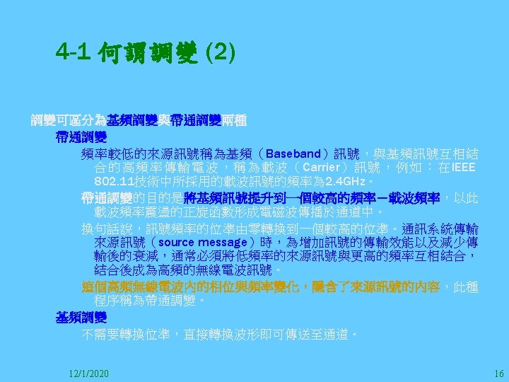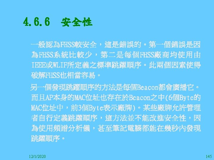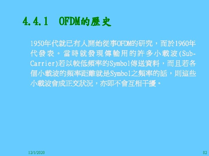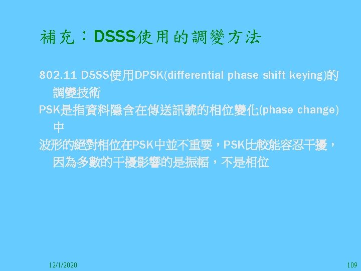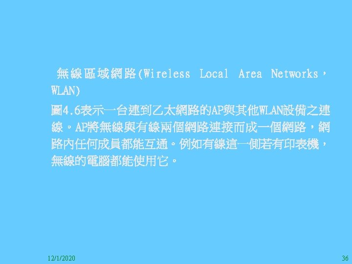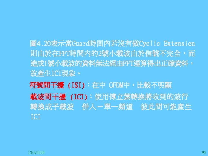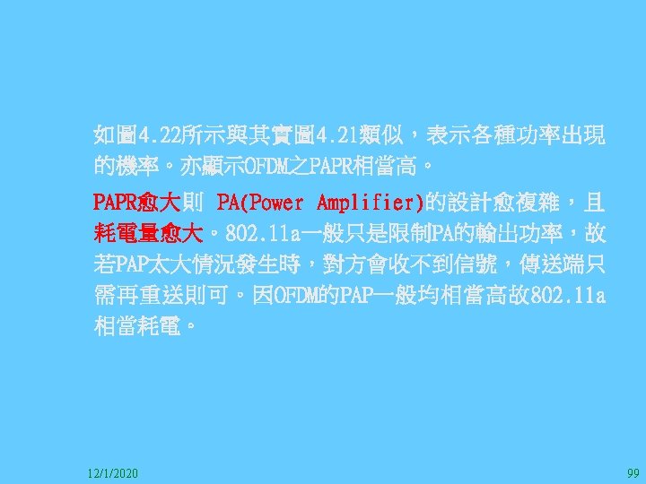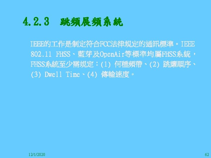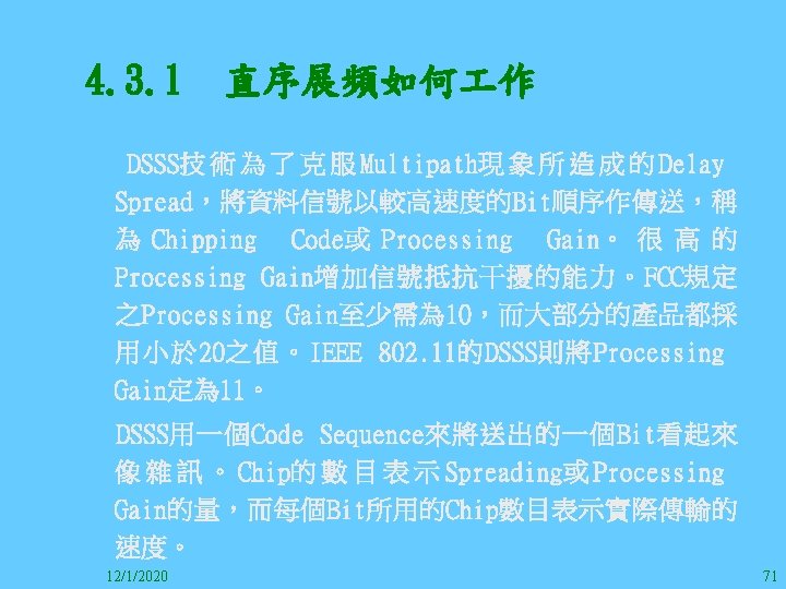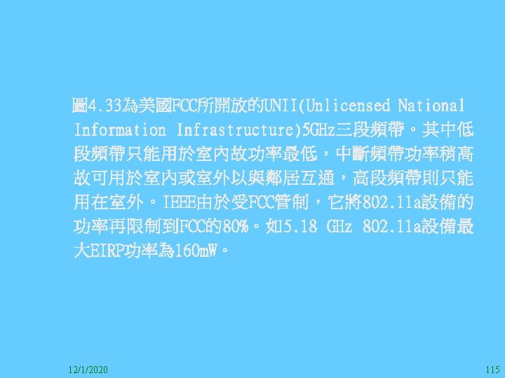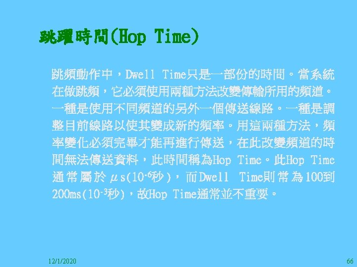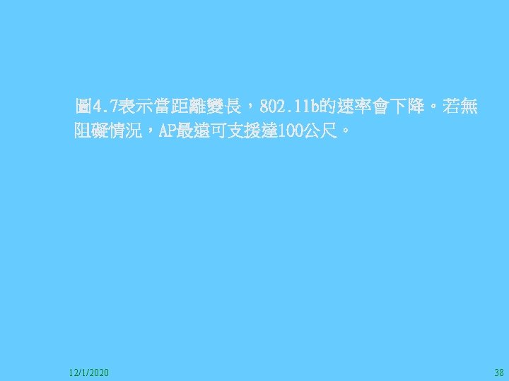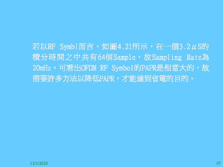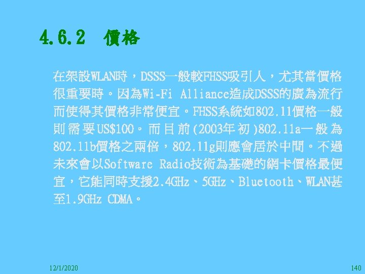 1212020 2 1212020 3 1212020 4 1212020 5 Slides: 147 Download presentation 12/1/2020 2 12/1/2020 3 12/1/2020 4 12/1/2020 5 12/1/2020 6 12/1/2020 7 12/1/2020 8 12/1/2020 9 12/1/2020 10 12/1/2020 11 IEEE 802系列的網路協定 12/1/2020 13 12/1/2020 25 12/1/2020 27 12/1/2020 30 在WLAN之外,WPAN (Wireless Personal Area Network)、WMAN(Wireless Metropolitan Area Network) 、以及WWAN(Wireless Wide Area Network)也都能使 用展頻技術。WPAN使用藍芽技術利用非常低的功率在 很短的距離作無線通訊。WMAN及WWAN使用高方向性天 線配合相當低的功率作長距離通訊。 12/1/2020 31 12/1/2020 32 下圖表示 802. 11 WLAN、802. 16 WMAN與802. 20 WWAN技 術之比較。 12/1/2020 33 IEEE 802系列的網路協定 12/1/2020 34 12/1/2020 35 12/1/2020 37 12/1/2020 39 12/1/2020 40 12/1/2020 41 12/1/2020 42 12/1/2020 43 12/1/2020 45 12/1/2020 47 12/1/2020 49 12/1/2020 50 12/1/2020 52 12/1/2020 54 (補充自Ch. 3) 12/1/2020 57 (補充自Ch. 3) 調變動作就是將數位信號的資訊Modulate到載波之上。 而最基本的調變方式為AM(Amplitude Modulation)、 FM(Frequency Modulation)、 與 PM(Phase Modulation)、 與 QAM(Quadratune Amplitude Modulation)。 AM以正弦波的大小做調變,FM以頻率做調變,PM以 相位做調變,而QAM以大小及相位做調變。 12/1/2020 58 12/1/2020 64 12/1/2020 74 12/1/2020 76 12/1/2020 78 12/1/2020 87 12/1/2020 89 FDM與OFDM的頻道分配特徵 12/1/2020 90 12/1/2020 94 12/1/2020 96 12/1/2020 98 12/1/2020 101 12/1/2020 103 4. 4. 7 Coding 如802. 11使用的Coding技術是Barker Code,802. 11 b 使用的Coding技術是CCK。Coding技術增加資料的抗干 擾性,若接收端漏掉一些Bit,還是有可能補回來。 802. 11 a用的是Convolutional Encoder。 12/1/2020 104 12/1/2020 106 12/1/2020 108 DBPSK的調變技術 12/1/2020 110 使用DBPSK來表示字母M 12/1/2020 111 DQPSK的調變技術 12/1/2020 112 使用DQPSK來表示字母M 12/1/2020 113 12/1/2020 116 12/1/2020 118 12/1/2020 120 4. 4. 12 未來的3 G與4 G系統 除 802. 11 a外,歐洲的Hiper. LAN 2(High-Performance Radio LAN 2)以 及 日 本 的 MMAC(Mobile Multimedia Access Communications)都是採用OFDM技術。 目前的3 G系統均屬於CDMA(Code-Division Multiple Access)技術,但有一家行動通訊業者正慎重考慮用 OFDM建制它的3 G,它是Nextel。4 G是否採用OFDM則眾 說紛紜,主要是政治問題,若存就技術面當然就是 OFDM。 12/1/2020 121 4. 5 CDMA(Code Division Multiple Access) CDMA-2000主要推手是美國的Qualcomm公司,W-CDMA為 歐洲之GSM的3 G代表作。CDMA-2000的標準Brand Name 為cdma 2000,故本文之後將使用cdma 2000。圖 4. 36是 各種 2 G技術如何升級到cdma 2000與W-CDMA的方式,以 及 手 機 所 需 要 相 對 提 昇 的 DSP(Digital Signal Processor)運算能力。 12/1/2020 122 12/1/2020 123 12/1/2020 125 12/1/2020 127 12/1/2020 129 12/1/2020 130 4. 5. 2 CDMA的特色 WARC 92(World Administrative Radio Conference’ 92)大 會 定 義 1885~2025 MHz與 2110~2200 MHz之 間 共 230 MHz頻 帶 將 被 作 為 全 球 IMT 2000的使用,。最後ITU將這些計劃歸為五類。分別是: (1) CDMA-DS (2) CDMA-MC (3) CDMA-TDD(Time. Division. Duplex)或稱TD-SCDMA (Time Division Synchronous CDMA) (4) TDMA-SC(TDMA-Single Carrier), (5) FDMA/TDMA。 12/1/2020 131 12/1/2020 132 12/1/2020 133 12/1/2020 135 圖 4. 50為ITU、各個SDO、3 GPP 2等組織之互動, 於 1998年 , 日 本 的 ARIB與 Telecommunication Technology Committee(TTC)、 美 國 的 T 1與 韓 國 的 Telecommunication Technology Association(TTA)及 中國的China Wireless Telecommunication Standard (CWTS)等六個SDO組合成 3 GPP。3 GPP最早的目的是以 GSM為 網 路 核 心 , 使 用 W-CDMA FDD及 TDD而 發 展 UTRA(Universal Terrestrial Radio Access),之後 又加入了GPRS與EDGE的發展。 12/1/2020 136 12/1/2020 137 12/1/2020 142 4. 7 結論 WLAN所 使 用 的 展 頻 技 術 之 演 進 非 常 的 快 , 1997的 802. 11用 到 2. 4 GHz 1與 2 Mbps的 FHSS與 DSSS, 1999的 802. 11 b用 到 2. 4 GHz 11 Mbps的 DSSS及 5 GHz 54 Mbps的 OFDM。 2003年 6月 通 過 了 802. 11 g的 2. 4 GHz 54 Mbps OFDM。即將成立的802. 11 n Task Group可能在 2006年 將速度再提升到 100至 300 Mbps水準。屆時802. 15 WPAN 及802. 16 WMAN可能變的不具意義,而只要有802. 11 n 則可。 12/1/2020 147