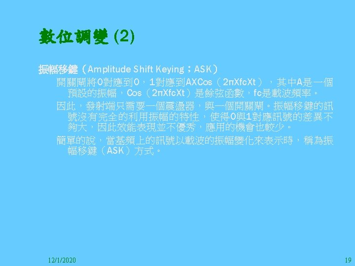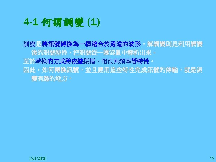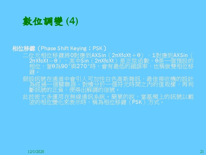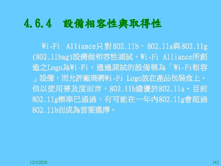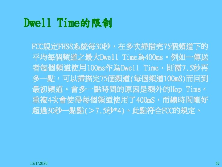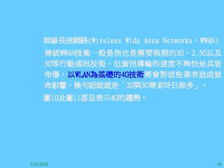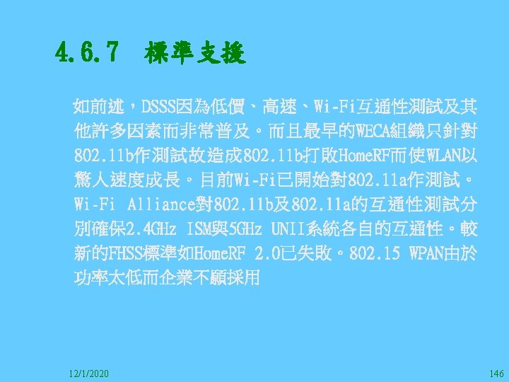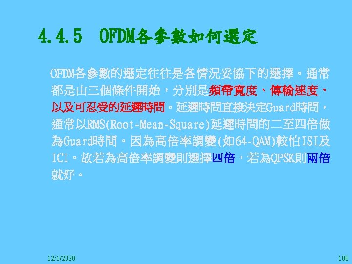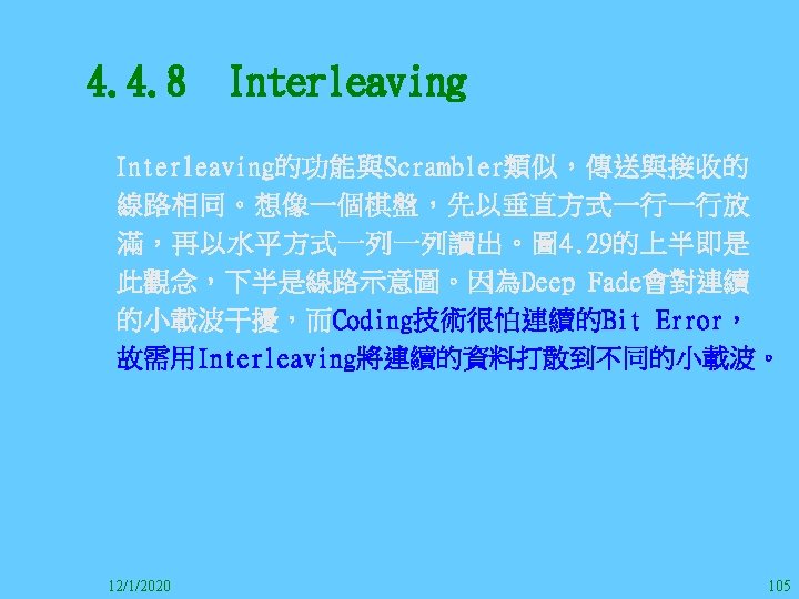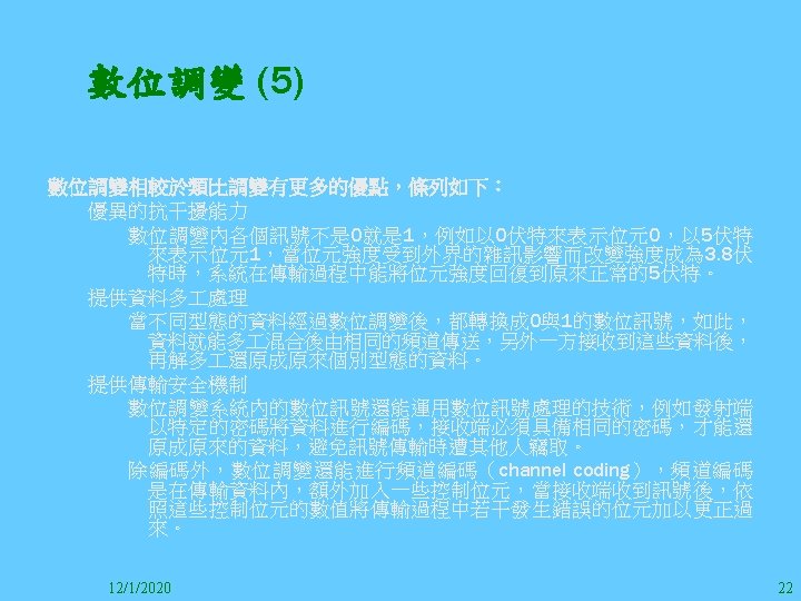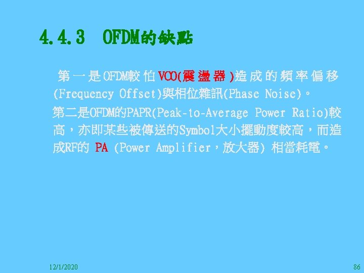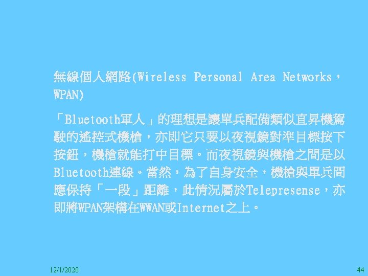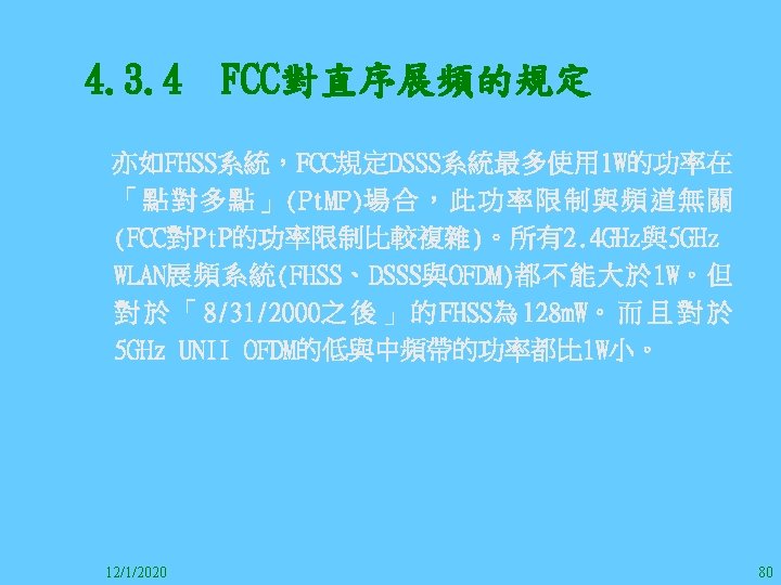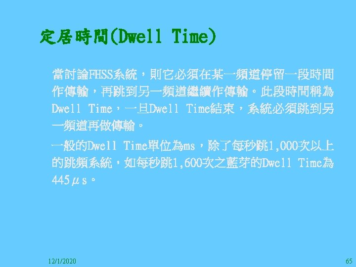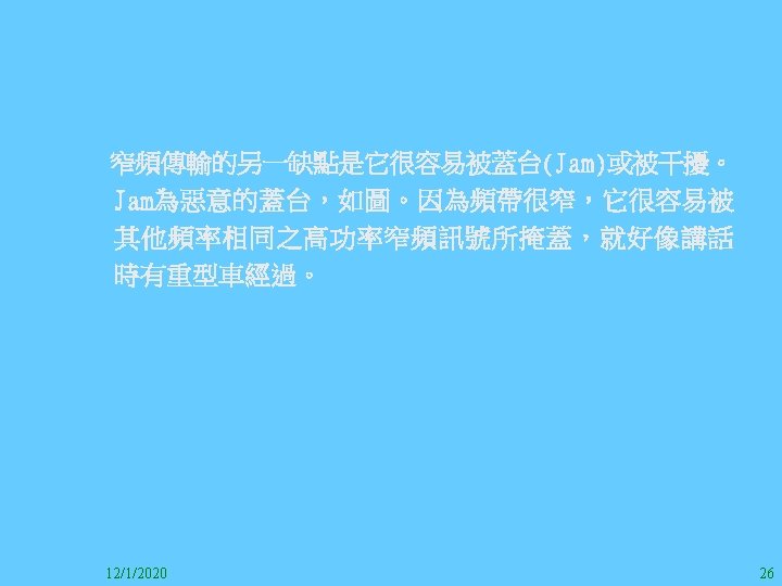 1212020 2 1212020 3 1212020 4 1212020 5 Slides: 147 Download presentation 12/1/2020 2 12/1/2020 3 12/1/2020 4 12/1/2020 5 12/1/2020 6 12/1/2020 7 12/1/2020 8 12/1/2020 9 12/1/2020 10 12/1/2020 11 IEEE 802系列的網路協定 12/1/2020 13 12/1/2020 25 12/1/2020 27 12/1/2020 30 在WLAN之外,WPAN (Wireless Personal Area Network)、WMAN(Wireless Metropolitan Area Network) 、以及WWAN(Wireless Wide Area Network)也都能使 用展頻技術。WPAN使用藍芽技術利用非常低的功率在 很短的距離作無線通訊。WMAN及WWAN使用高方向性天 線配合相當低的功率作長距離通訊。 12/1/2020 31 12/1/2020 32 下圖表示 802. 11 WLAN、802. 16 WMAN與802. 20 WWAN技 術之比較。 12/1/2020 33 IEEE 802系列的網路協定 12/1/2020 34 12/1/2020 35 12/1/2020 37 12/1/2020 39 12/1/2020 40 12/1/2020 41 12/1/2020 42 12/1/2020 43 12/1/2020 45 12/1/2020 47 12/1/2020 49 12/1/2020 50 12/1/2020 52 12/1/2020 54 (補充自Ch. 3) 12/1/2020 57 (補充自Ch. 3) 調變動作就是將數位信號的資訊Modulate到載波之上。 而最基本的調變方式為AM(Amplitude Modulation)、 FM(Frequency Modulation)、 與 PM(Phase Modulation)、 與 QAM(Quadratune Amplitude Modulation)。 AM以正弦波的大小做調變,FM以頻率做調變,PM以 相位做調變,而QAM以大小及相位做調變。 12/1/2020 58 12/1/2020 64 12/1/2020 74 12/1/2020 76 12/1/2020 78 12/1/2020 87 12/1/2020 89 FDM與OFDM的頻道分配特徵 12/1/2020 90 12/1/2020 94 12/1/2020 96 12/1/2020 98 12/1/2020 101 12/1/2020 103 4. 4. 7 Coding 如802. 11使用的Coding技術是Barker Code,802. 11 b 使用的Coding技術是CCK。Coding技術增加資料的抗干 擾性,若接收端漏掉一些Bit,還是有可能補回來。 802. 11 a用的是Convolutional Encoder。 12/1/2020 104 12/1/2020 106 12/1/2020 108 DBPSK的調變技術 12/1/2020 110 使用DBPSK來表示字母M 12/1/2020 111 DQPSK的調變技術 12/1/2020 112 使用DQPSK來表示字母M 12/1/2020 113 12/1/2020 116 12/1/2020 118 12/1/2020 120 4. 4. 12 未來的3 G與4 G系統 除 802. 11 a外,歐洲的Hiper. LAN 2(High-Performance Radio LAN 2)以 及 日 本 的 MMAC(Mobile Multimedia Access Communications)都是採用OFDM技術。 目前的3 G系統均屬於CDMA(Code-Division Multiple Access)技術,但有一家行動通訊業者正慎重考慮用 OFDM建制它的3 G,它是Nextel。4 G是否採用OFDM則眾 說紛紜,主要是政治問題,若存就技術面當然就是 OFDM。 12/1/2020 121 4. 5 CDMA(Code Division Multiple Access) CDMA-2000主要推手是美國的Qualcomm公司,W-CDMA為 歐洲之GSM的3 G代表作。CDMA-2000的標準Brand Name 為cdma 2000,故本文之後將使用cdma 2000。圖 4. 36是 各種 2 G技術如何升級到cdma 2000與W-CDMA的方式,以 及 手 機 所 需 要 相 對 提 昇 的 DSP(Digital Signal Processor)運算能力。 12/1/2020 122 12/1/2020 123 12/1/2020 125 12/1/2020 127 12/1/2020 129 12/1/2020 130 4. 5. 2 CDMA的特色 WARC 92(World Administrative Radio Conference’ 92)大 會 定 義 1885~2025 MHz與 2110~2200 MHz之 間 共 230 MHz頻 帶 將 被 作 為 全 球 IMT 2000的使用,。最後ITU將這些計劃歸為五類。分別是: (1) CDMA-DS (2) CDMA-MC (3) CDMA-TDD(Time. Division. Duplex)或稱TD-SCDMA (Time Division Synchronous CDMA) (4) TDMA-SC(TDMA-Single Carrier), (5) FDMA/TDMA。 12/1/2020 131 12/1/2020 132 12/1/2020 133 12/1/2020 135 圖 4. 50為ITU、各個SDO、3 GPP 2等組織之互動, 於 1998年 , 日 本 的 ARIB與 Telecommunication Technology Committee(TTC)、 美 國 的 T 1與 韓 國 的 Telecommunication Technology Association(TTA)及 中國的China Wireless Telecommunication Standard (CWTS)等六個SDO組合成 3 GPP。3 GPP最早的目的是以 GSM為 網 路 核 心 , 使 用 W-CDMA FDD及 TDD而 發 展 UTRA(Universal Terrestrial Radio Access),之後 又加入了GPRS與EDGE的發展。 12/1/2020 136 12/1/2020 137 12/1/2020 142 4. 7 結論 WLAN所 使 用 的 展 頻 技 術 之 演 進 非 常 的 快 , 1997的 802. 11用 到 2. 4 GHz 1與 2 Mbps的 FHSS與 DSSS, 1999的 802. 11 b用 到 2. 4 GHz 11 Mbps的 DSSS及 5 GHz 54 Mbps的 OFDM。 2003年 6月 通 過 了 802. 11 g的 2. 4 GHz 54 Mbps OFDM。即將成立的802. 11 n Task Group可能在 2006年 將速度再提升到 100至 300 Mbps水準。屆時802. 15 WPAN 及802. 16 WMAN可能變的不具意義,而只要有802. 11 n 則可。 12/1/2020 147