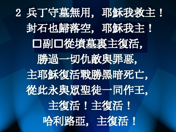 2 兵丁守墓無用,耶穌我救主! 封石也歸落空,耶穌我主! �副�從墳墓裏主復活,勝過一切 仇敵與罪惡,主耶穌復活 戰勝黑暗死亡,從此永與眾聖徒 一同作王,主復活! 哈利路亞,主復活! Vainly they watch His bed Jesus, my saviour ! Vainly they seal the dead Jesus, my Lord! � Refrain� Up from the grave He arose, With a mighty triumph’er His foes; He arose a victor from the dark domain, And He lives forever with his saints to reign. He arose! Hallelujah! Christ arose