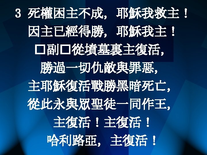 3 死權困主不成,耶穌我救主! 因主已經得勝,耶穌我主! �副�從墳墓裏主復活,勝過一切 仇敵與罪惡,主耶穌復活 戰勝黑暗死亡,從此永與眾聖徒 一同作王,主復活! 哈利路亞,主復活! Death can not keep his prey Jesus, my saviour ! He tore the bars a way Jesus, my Lord! � Refrain� Up from the grave He arose, With a mighty triumph’er His foes; He arose a victor from the dark domain, And He lives forever with his saints to reign. He arose! Hallelujah! Christ arose