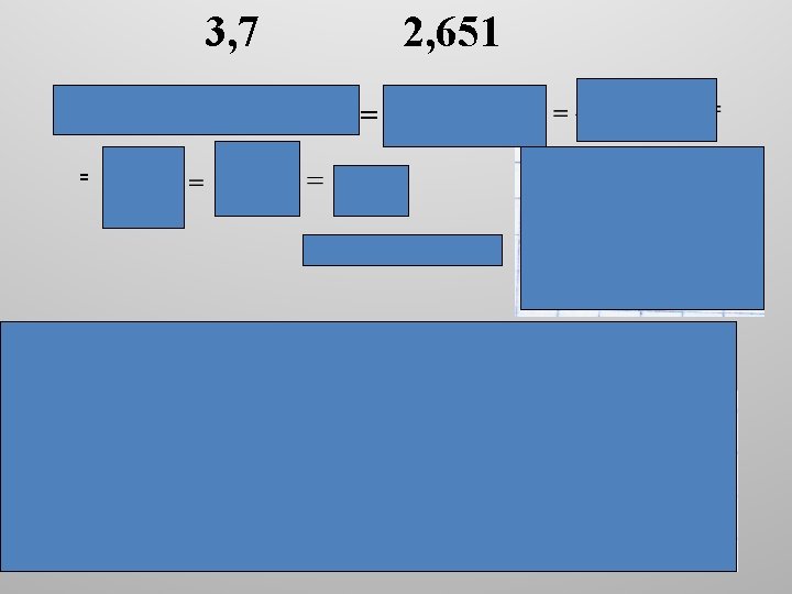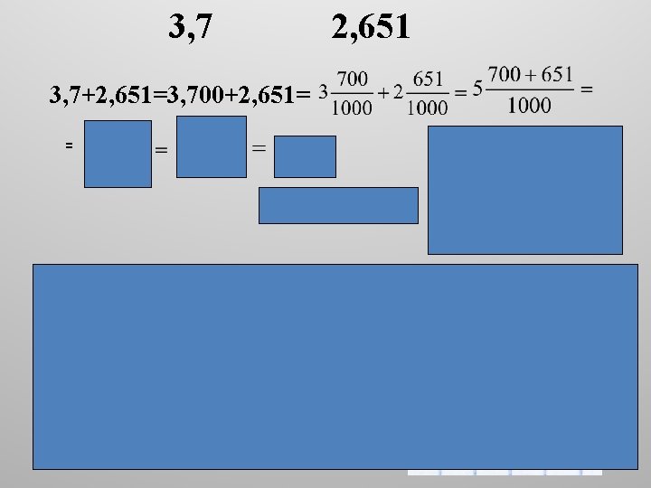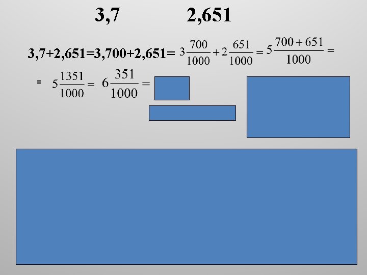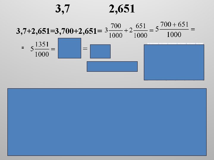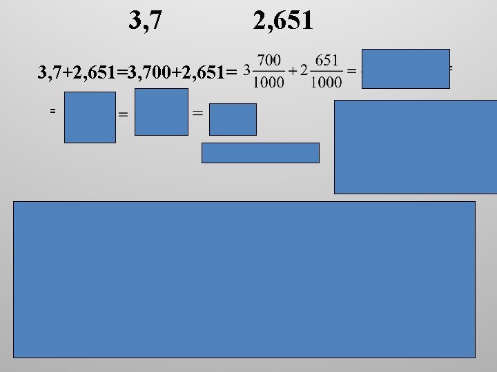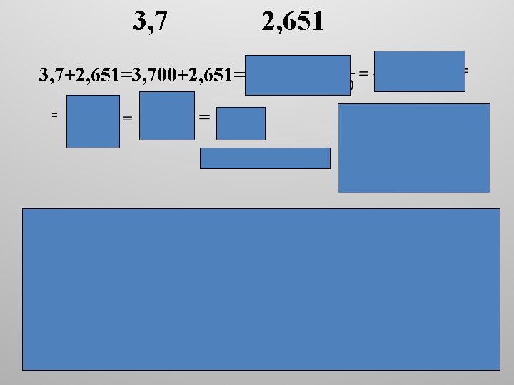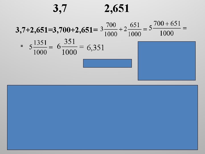 3, 7 2, 651 3, 7+2, 651=3, 700+2, 651= = 6, 351 Qulay usulda: 3, 7 -2, 651=3, 700 -2, 651= = 1, 049 Пишут короче: