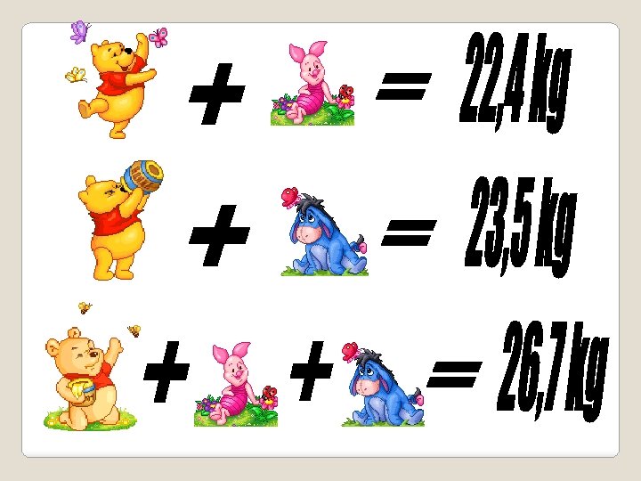 Masala: Uchta do’st Ayiqcha , Puchqvoy , Xo’tikvoy o’z og’irliklarini o’lchab olmoqchi bo’ldilar. Ammo , tarozining 20 kggacha bo’lgan shkalasi buzilib qolgan edi va ular qo’yidagicha o’lchashlarni amalga oshirdilar. Ayiqvoy avval Puchiqvoy bilan birga o’girligini o’lchab ko’rdilar va natija 22, 4 kg bo’ldi. So’ngra Ayiqvoy va Xo’tikvoy birga o’girligini o’lchab ko’rdilar va natija 23, 5 kg bo’ldi. So’ngra ularning uchalasi birga o’z og’irligini o’lchashdi va natija 26, 7 ga teng bo’ldi. Ularning har birining massasi necha kilogrammdan?