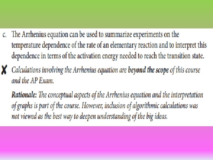 Frequency Factor and Exponential Factor • Frequency factor (A): the number of times that the reactants approach the activation barrier per unit time. • There are many instances when the particles collide and the reactant(s) approach the activation barrier, but most approaches are unsuccessful in overcoming the amount of energy necessary for the reaction to occur. • The exponential factor: a number between 0 and 1 that represents the fraction of particles that have enough energy to overcome the activation energy on a given approach. The exponential factor depends on both temperature and the activation energy of the reaction. • The rate constant k = frequency factor X exponential factor