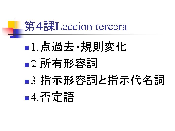 13 ar cant cantaste cant cantar cantamos cantasteis Slides: 26 Download presentation 1.直説法・点過去 1/3 ar動詞 cant-é cant-a-ste cant-ó cant-a-r cant-a-mos cant-a-steis cant-a-ron 1.直説法・点過去 2/3 er動詞 com-e-r com-í com-i-mos com-i-steis com-i-ó com-ie-ron 1.直説法・点過去 3/3 ir動詞 viv-i-r viv-í viv-i-mos viv-i-steis viv-i-ó viv-ie-ron n 2.所有形容詞 1/7 mi tu su nuestro vuestro su 2.所有形容詞 2/7 Mi coche está aquí. n ¿Dónde está tu coche? n No sé dónde está su casa. n 2.所有形容詞 3/7 mi libro – mis libros n tu carta – tus cartas n su lápiz – sus lápices n 2.所有形容詞 4/7 nuestra clase – nuestras clases n vuestra casa – vuestras casas n su coche - sus coches n 2.所有形容詞 5/7 mío tuyo suyo nuestro vuestro suyos 2.所有形容詞 6/7 un amigo mío n una amiga mía n amigos míos amigas mías 2.所有形容詞 7/7 Un amigo mío desea hablar con usted. n Esta habitación es mía. n Aquí está tu paraguas. ¿Dónde está el mío? n 3.指示形容詞 este libro n esta casa n estos libros estas casas 3.指示形容詞 ese libro n esa casa n esos libros esas casas 3.指示形容詞 あの 単数 n 男性 aquel n 女性 aquella n 複数 aquellos aquellas 3.指示形容詞 aquel libro n aquella casa n aquellos libros aquellas casas 5.否定語 代 名 詞 : nadie, nada, ninguno (ninguna). n 形 容 詞 : ninguno [ningún] (ninguna). n 5.否定語 副 詞 : nunca, ni, jamás, tampoco, apenas. n 接続詞:ni, ni. . . n