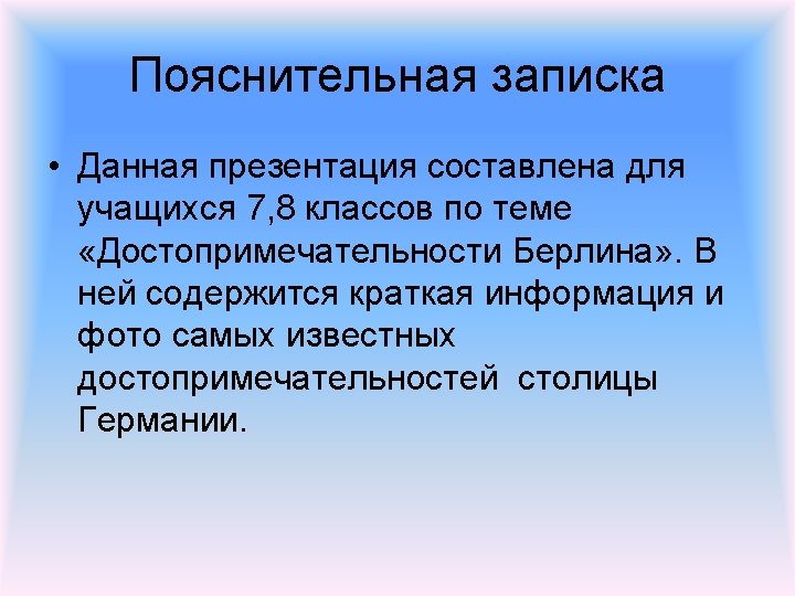 • 13. Jahrhundert- wurde Berlin gegründet; • 1871 - wurde Berlin zur Hauptstadt des deutschen Kaiserreiches; • 1948 -1989 - war Berlin in zwei Teile geteilt; • 1989 - wurde Berlin zur Hauptstadt der BRD.