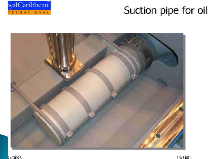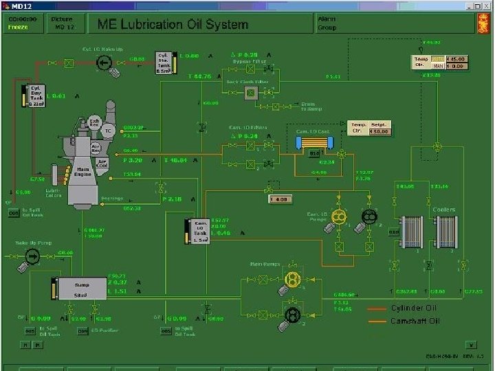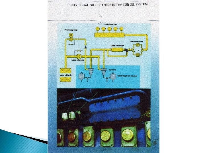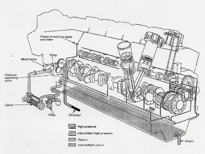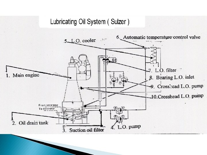6. DESCRIPTION OF A LUBRICATION PROCEDURE Ø L. O. pressure pumps draw the oil from the drain tank / lub oil tank / pan through the suction strainers. The drain tank is fitted with a level gauge. Ø Pumps discharge oil through fine filters to the cooler ( the discharge pressure ensures that there will be no leakage of salt water into the oil in the event of faulty cooler. ) Ø L. O. thermostatic valve, mounted on the cooler, regulates the oil temperature flow of either the lubricating oil or the cooling water. Ø Regulating valves control the oil distribution and its pressure in all moving components. Ø Pressure gauges are fitted before and after the filter(s) Ø The system is fitted with a number of alarms: pressure loss alarm, oil level alarm in drain tank, temperature alarm, pressure relief valves ( usualy mounted at pump discharge. ) Ø Oil should be permanently purified at sea. It may be also heated to assist purification.