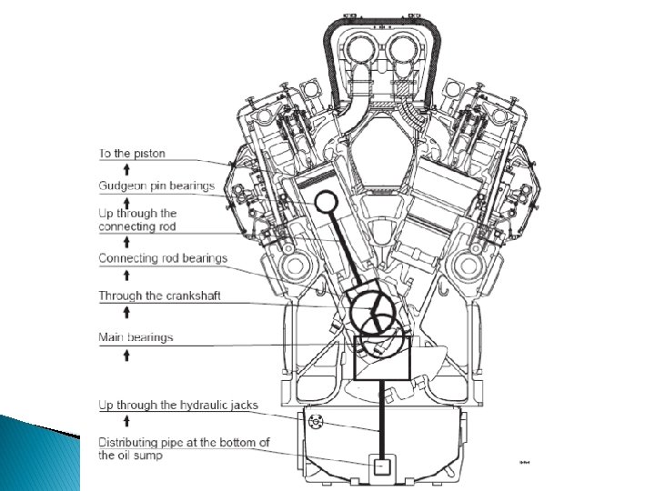 The Basics of the Lubricating Oil System Lubricating oil for a marine diesel engine achieves two objectives; it must cool and lubricate. The oil is taken from the drain tank usually underneath the engine by a screw type pump. It is cooled, filtered and supplied to the engine via the oil inlet pipe or inlet rail at a pressure of about 4 bar. On a medium speed 4 stroke engine the oil is supplied to the main bearings through drillings in the engine frame to the crankshaft main bearings. Drillings in the crankshaft then take the oil to the crankpin or bottom end bearings. The oil is then led up the connecting rod to the piston or gudgeon pin and from there to the piston cooling before returning to the crankcase.