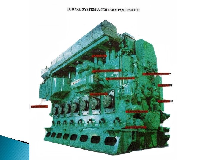 4. LUBRICATING SYSTEM DIVISIONS 4. 1 THE INTERNAL DIVISION OR ENGINE PART OF THE SYSTEM: Passages / ducts & piping. 4. 2 EXTERNAL PART OF THE SYSTEM: Sump, pumps, coolers, strainers & filters and purifiers. This system is of pressure type or forced lubrication type. 5. LUBRICATING SYSTEMS IN LARGE MARINE DIESEL ENGINES OF CROSSHEAD CONSTRUCTION