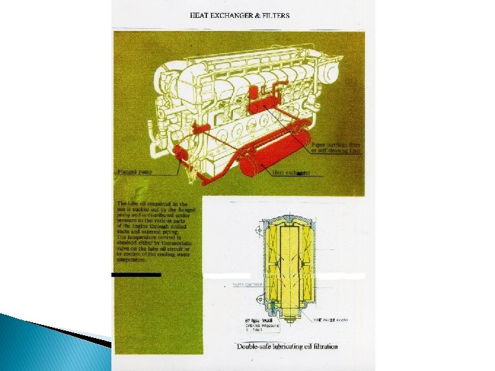 � As the oil becomes very viscous when cold, it is essential to have a temperature control so that it is kept at a level which is neither too hot nor too cold. A thermostatic valve is mounted on the cooler which senses the temperature of the lubricating oil and regulates the flow of either the lubricating oil or the cooling water accordingly. � Pressure gauges are fitted to show the lubricating oil pressure before and after the filter. Any abnormally high difference in reading between the two gauges indicates that the element is blocked and should be changed or cleaned according to the type.