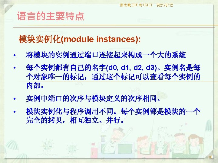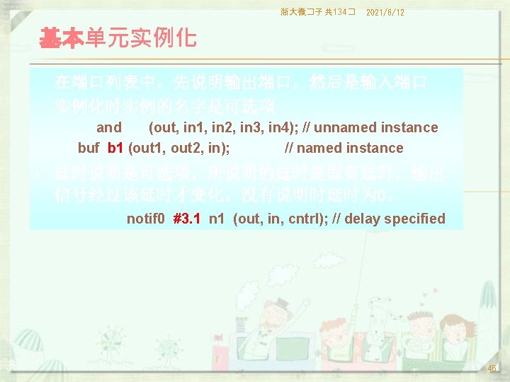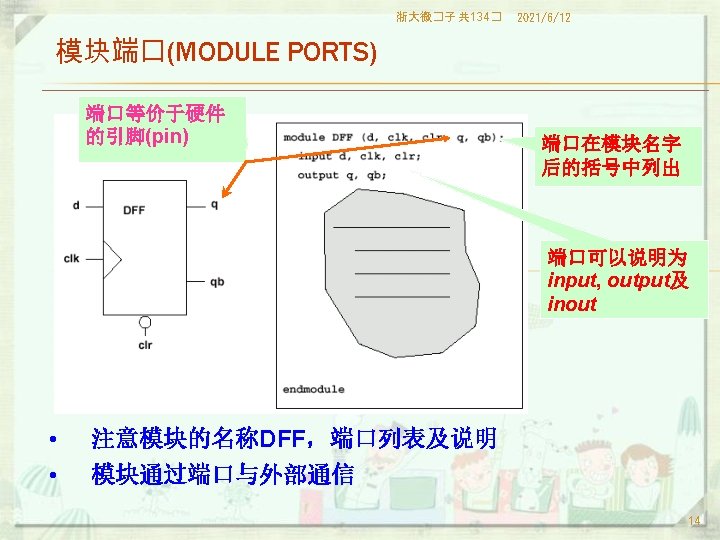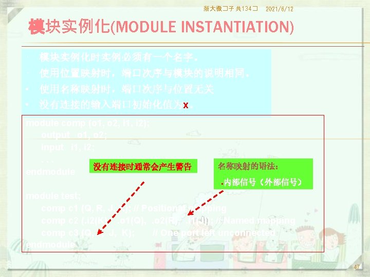 浙大微�子 共 134� 2021/6/12 模块实例化(MODULE INSTANCES) REG 4有模块DFF的 四个实例 module DFF (d, clk, clr, q, qb); . . endmodule REG 4( d, clk, clr, q, qb); output [3: 0] q, qb; input [3: 0] d; input clk, clr; DFF d 0 (d[ 0], clk, clr, q[ 0], qb[ 0]); DFF d 1 (d[ 1], clk, clr, q[ 1], qb[ 1]); DFF d 2 (d[ 2], clk, clr, q[ 2], qb[ 2]); DFF d 3 (d[ 3], clk, clr, q[ 3], qb[ 3]); endmodule 15