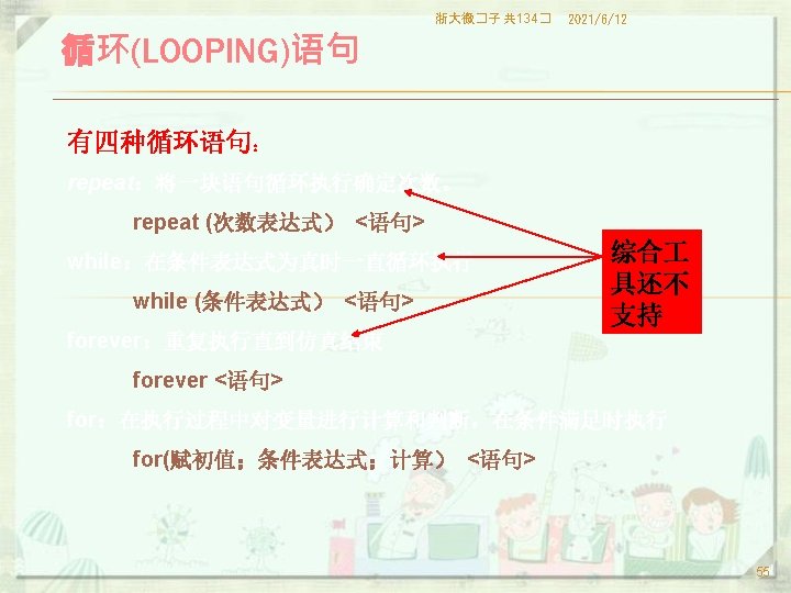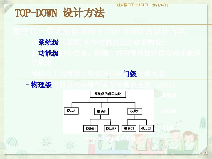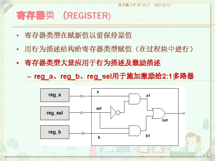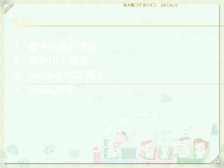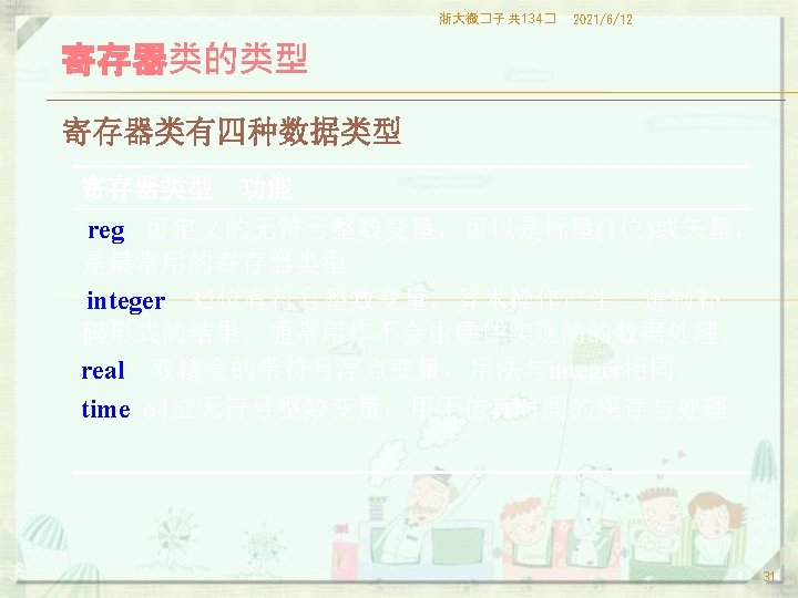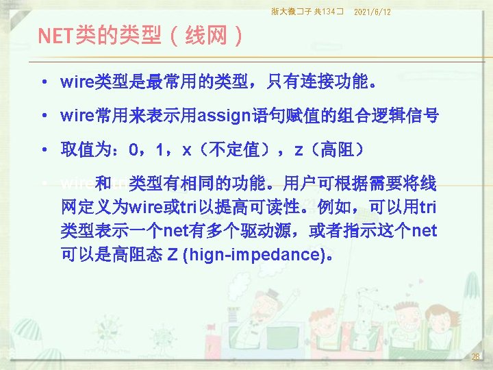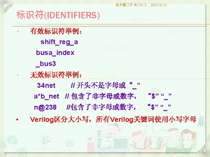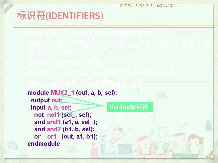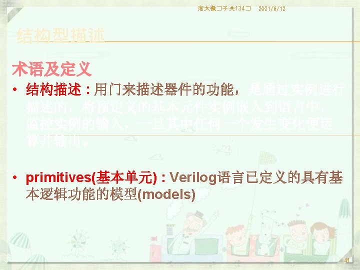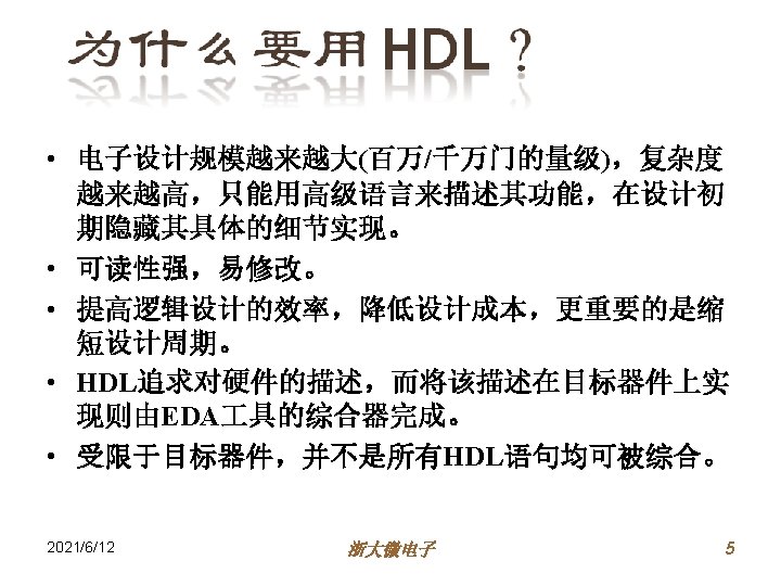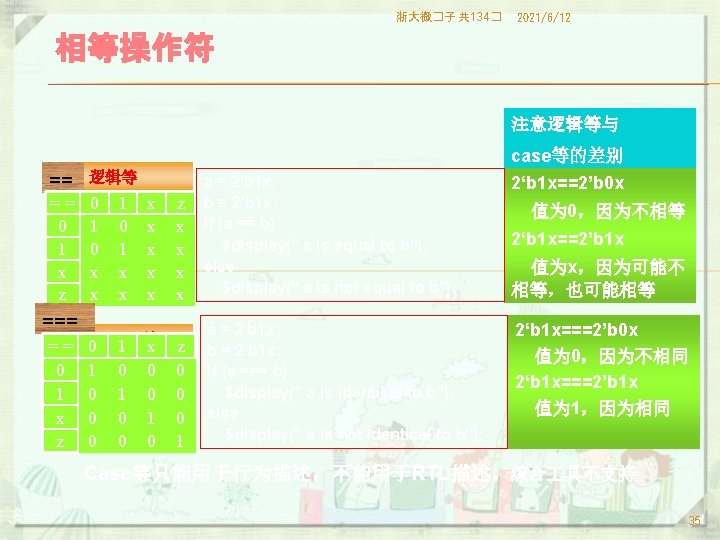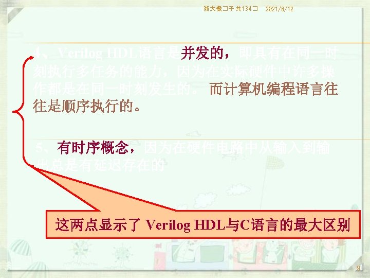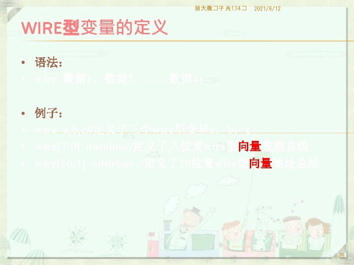 浙大微�子 共 134� 2021/6/12 VERILOG采用的四值逻辑系统 ’ 0’, Low, False, Logic Low, Ground, ‘ 1’, High, True, Logic High, Power, VDD, ’X’ Unknown: Occurs at Logic Which Cannot be Resolved Conflict Hi. Z, High Impedance, Tri- Stated, 20