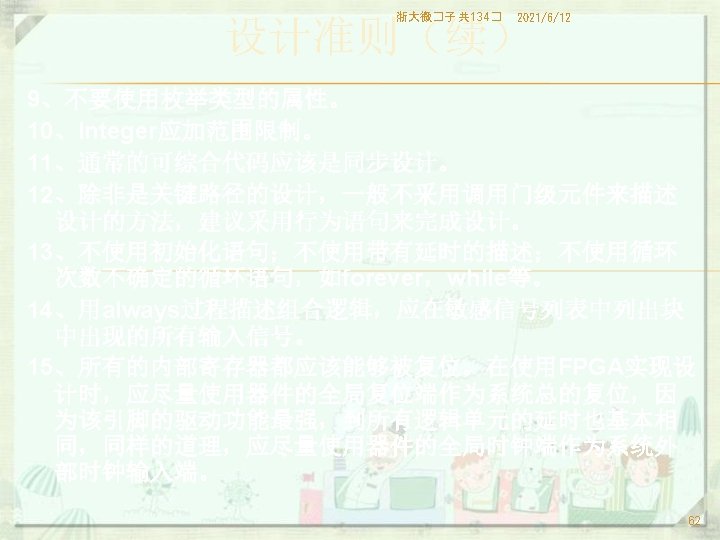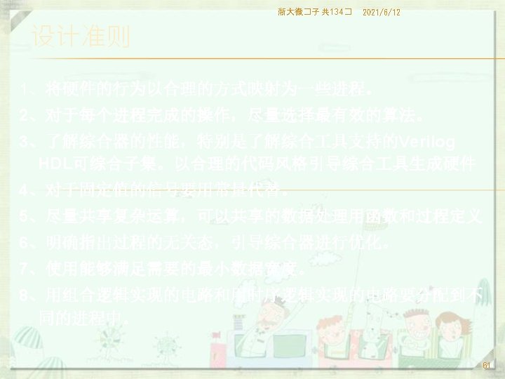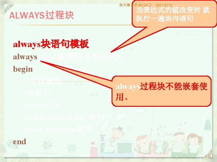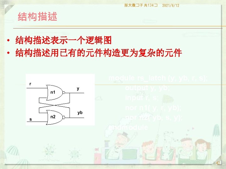 浙大微�子 共 134� 2021/6/12 混合描述的1位全加器 • • • module full_add 5(a, b, cin, sum, cout); input a, b, cin; output sum, cout; reg cout, m 1, m 2, m 3; //在always块中被赋值的变量应定义为reg型 wire s 1; xor x 1(s 1, a, b); //调用门元件 always@(a or b or cin) //always块语句 begin m 1=a&b; m 2=b&cin; m 3=a&cin; cout=(m 1|m 2)|m 3; end assign sum=s 1^cin; //assign持续赋值语句 endmodule 59