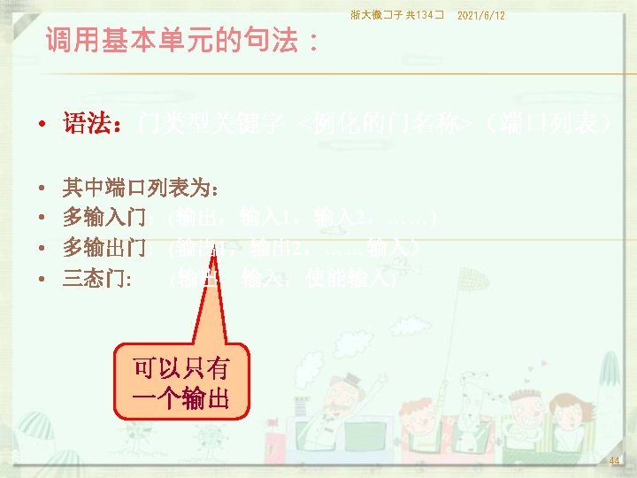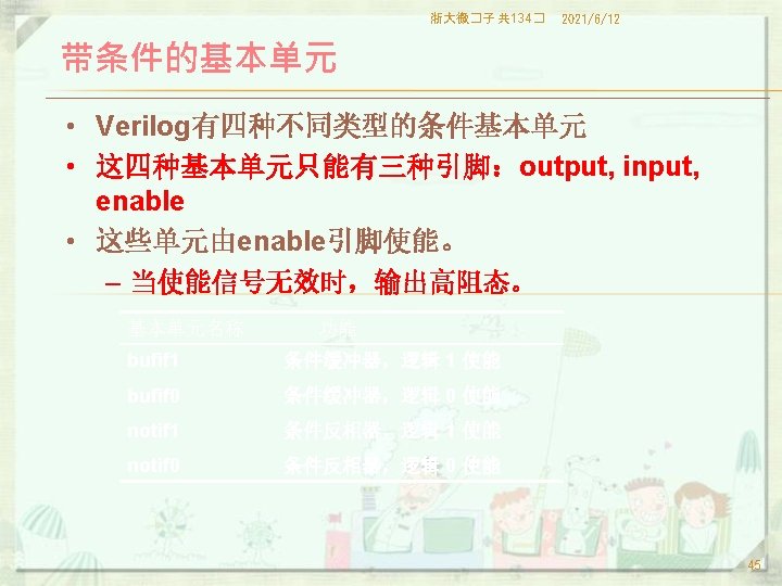 浙大微�子 共 134� 2021/6/12 VERILOG基本单元(PRIMITIVES) • Verilog基本单元提供基本的逻辑功能,这些逻辑功 能是预先定义的,用户不需要再定义这些基本功能 • 基本单元是Verilog 库的一部分,基本单元库是自下 而上(Bottom Up)设计方法的一部分 基本单元名称 功能 and or not buf xor nand nor xnor Logical And Logical Or Inverter Buffer Logical Exclusive Or Logical And Inverted Logical Or Inverted Logical Exclusive Or Inverted 43