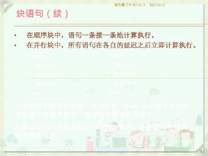 浙大微�子 共 134� 2021/6/12 `timescale 说明时间单位及精度 格式:`timescale <time_unit> / <time_precision> 如:`timescale 1 ns / 100 ps `timescale必须在模块之前出现 `timescale 1 ns / 10 ps // All time units are in multiples of 1 nanosecond module MUX 2_1 (out, a, b, sel); output out; input a, b, sel; not #1 not 1( sel_, sel); and #2 and 1( a 1, a, sel_); and #2 and 2( b 1, b, sel); or #1 or 1( out, a 1, b 1); endmodule 38
