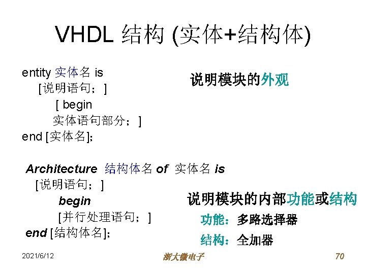 component Or_gate port (In 1 : Bit : In 2 : Bit ; Out 1 : out Bit ) ; end component ; -- component instantiation statements U 0 : Half_adder port map ( X => A, Y => B, Sum => Temp_sum, Carry => Temp_carry_1 ) ; U 1 : Half_adder port map ( X => Temp_sum , Y => Carry_in Sum => S , Carry => Temp _Carry_2 ) ; U 2 : Or_gate port map ( In 1 => Temp_carry_1, In 2 => Temp_carry_2 , Out 1 => Carry_out ) ; end structure ; 2021/6/12 69 浙大微电子