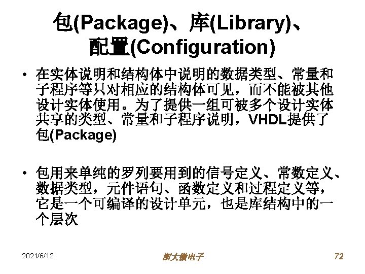 一个实体可以有多个不同的结构体 (比如有的速度快,有的硬件少) 所以:对应于同一实体的结构体不允许同名, 而对应于不同实体的结构体可以同名。 entity Full_adder is architecture Structure of Full_adder is architecture Structure 1 of Full_adder is entity mux is architecture Structure of mux is 2021/6/12 浙大微电子 71