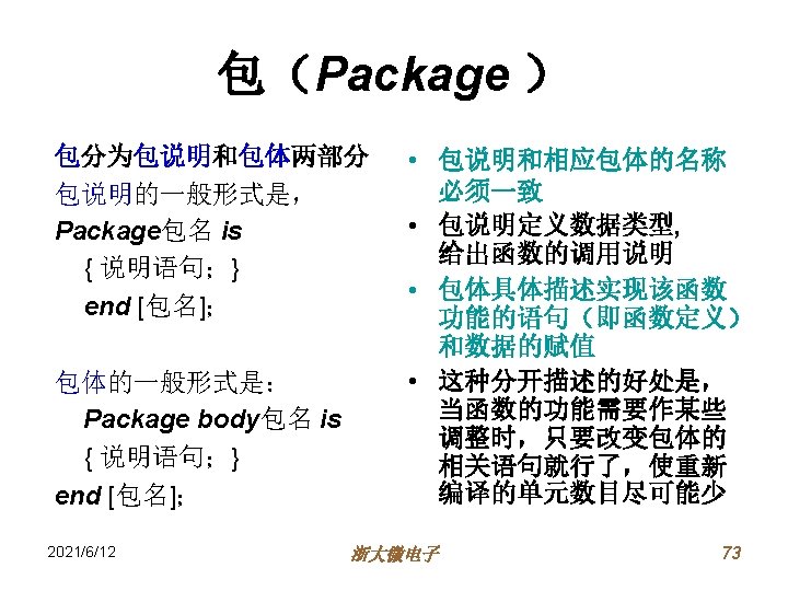 package body Logic is function invert( input: Three_level_1 ogic) return Three_level_logic is begin case lnput is when‘ 0’=> return‘ 1’; when‘ 1’=> return‘ 0’; when‘z’=> return‘z’; end case; end invert; end Logic; 函数定义(对外不可见) 2021/6/12 浙大微电子 75
