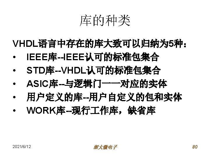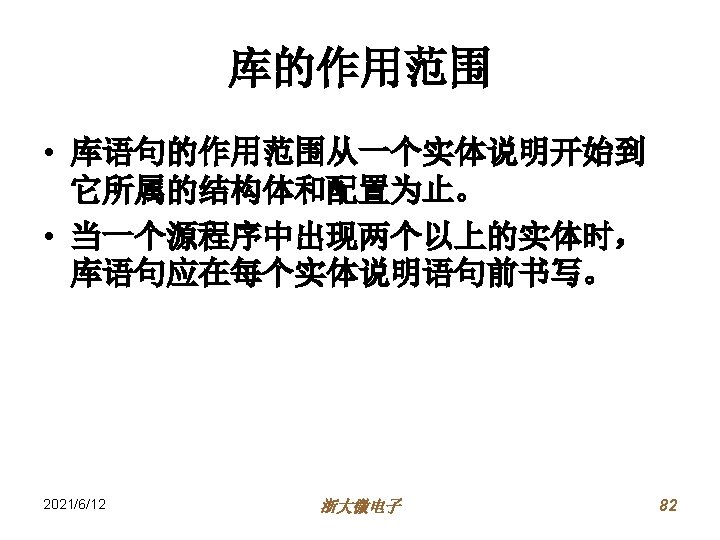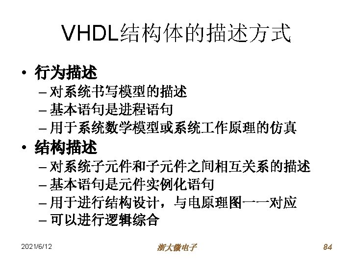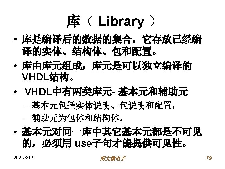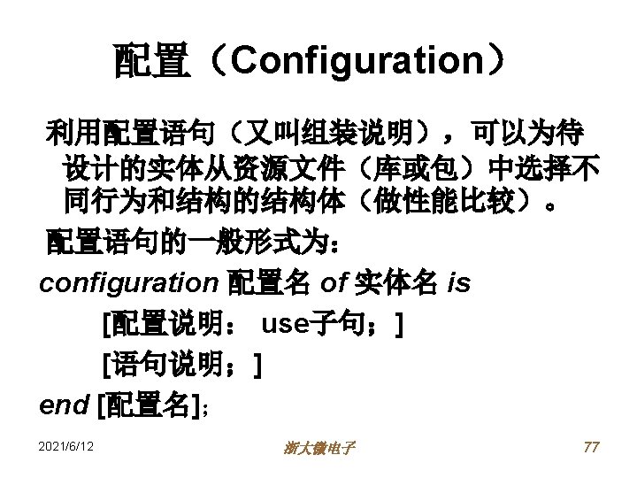 architecture Structure_View of Processor is *** end Structure_View; library TTL. Work; configuration V 4_27_87 of processor is use Work.All; for Structure_View *** end V 4_27_87; 2021/6/12 浙大微电子 78