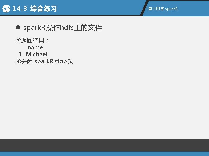 14. 3 综合练习 第十四章 Spark. R l spark. R操作hdfs上的文件 ①上传文件,并查看 hdfs. init() hdfs. put("/opt/bin/jar/people. json", "hdfs: //nameservice 1/tmp/resour ces/people 2. json") hdfs. cat("hdfs: //nameservice 1/tmp/resources/people. json")