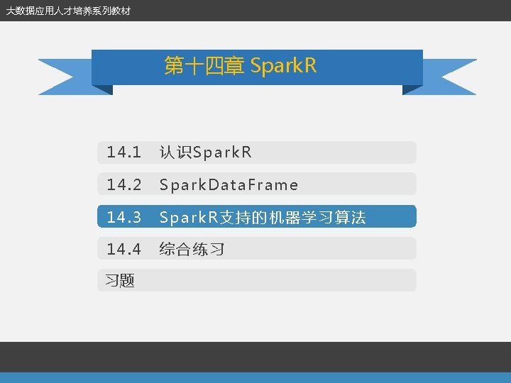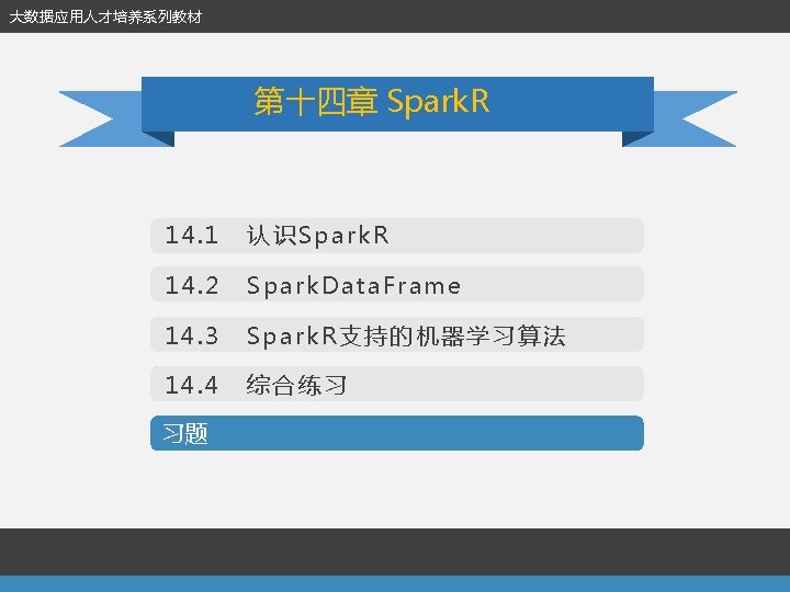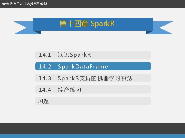 14. 1 认识Spark. R 第十四章 Spark. R l 安装Spark. R (2)安装Spark. R包 library(devtools) install_github("amplab-extras/Spark. Rpkg", subdir="pkg") USE_YARN=1 SPARK_YARN_VERSION=2. 4. 0 SPARK_HAD OOP_VERSION=2. 4. 0 USE_MAVEN=1. /install-dev. sh (3)Linux下加载R包 install. packages('Cairo', dependencies=TRUE, repos='http: //cran. rstudio. com/')