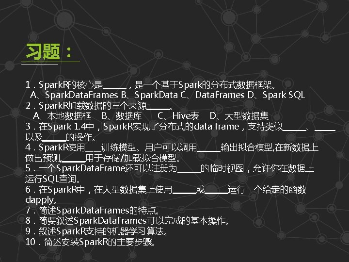 14. 1 认识Spark. R 第十四章 Spark. R l 安装Spark. R 此安装步骤是Spark跑在Hadoop Yarn架构上的安装方式,如 果是跑在独立的Spark环境上,请参照Spark. R官网 (https: //github. com/amplab-extras/ Spark. R-pkg)。 (1)安装依赖包: install. packages("r. Java") yum install libcurl-devel install. packages("RCurl") install. packages("devtools") 服务器需要安装maven服务(参照: http: //blog. csdn. net/zdnlp/article/details/7457596。