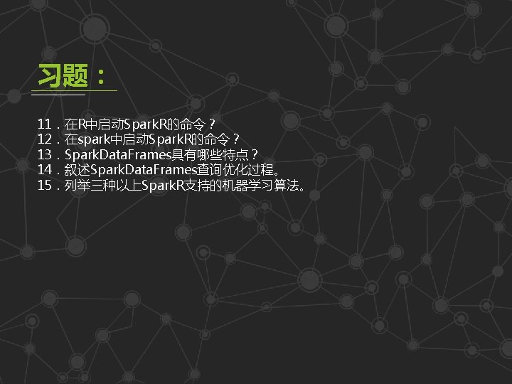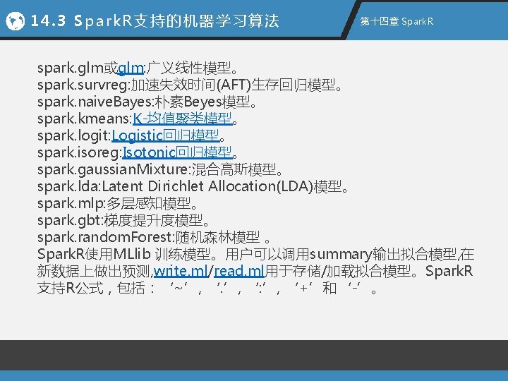 14. 1 认识Spark. R 第十四章 Spark. R l 在R或Rstudio中调用Spark. R library(Spark. R) sc<-spark. R. init(master="local", "Rword. Count") lines<- text. File(sc, "hdfs: //XXXIP): 8020/test/log. txt") words <-flat. Map(lines, function(line) {strsplit(line, ", ")[[1]]} ) count(words)