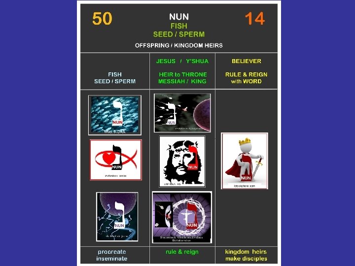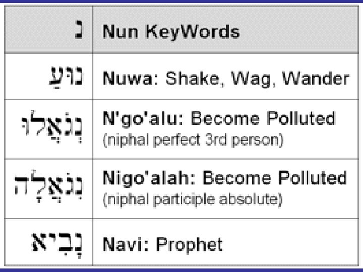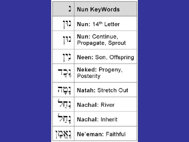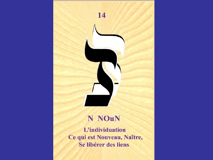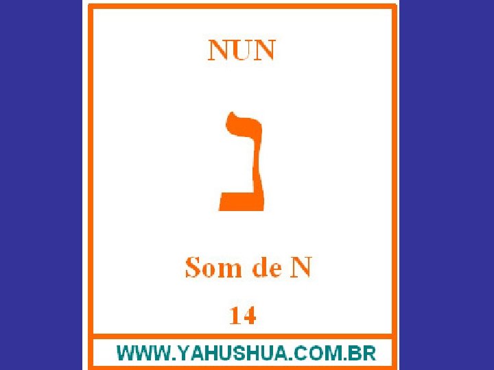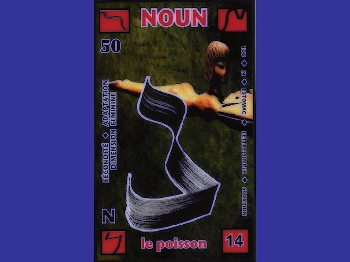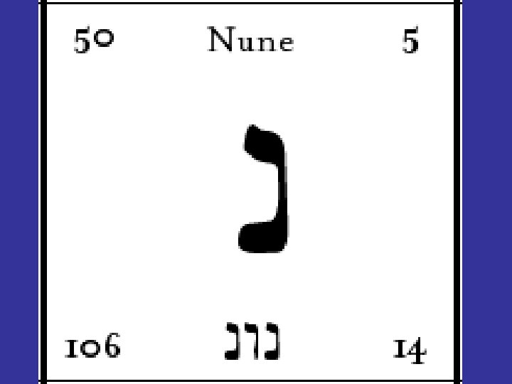 Letra lingual de valor numérico 50. La forma de la nun recuerda la de una semilla. En el hebreo clásico está formada por una vau doblada, coronada como una zayin. Algunos dicen que nun significa “perpetuación y rejuvenecimiento” Es, también, un símbolo de fidelidad. Nun es productividad, multiplicidad, caída y elevación simultáneas.
