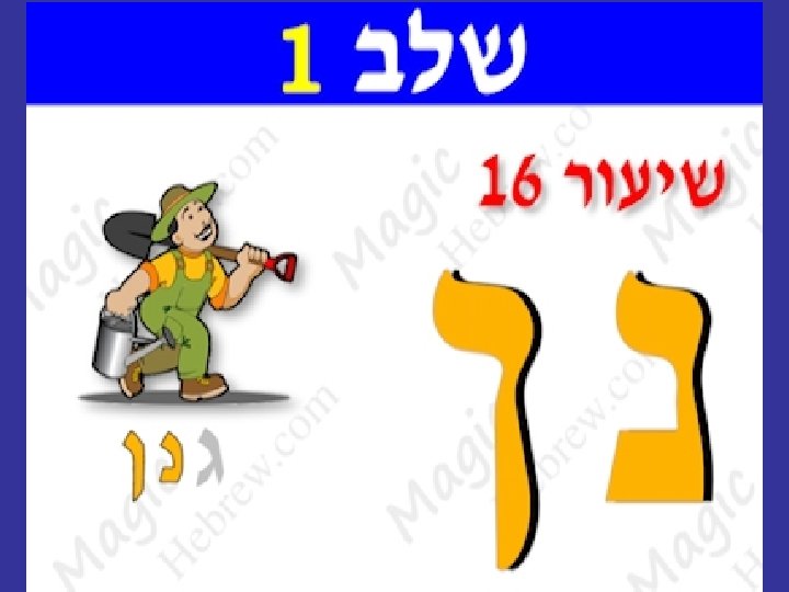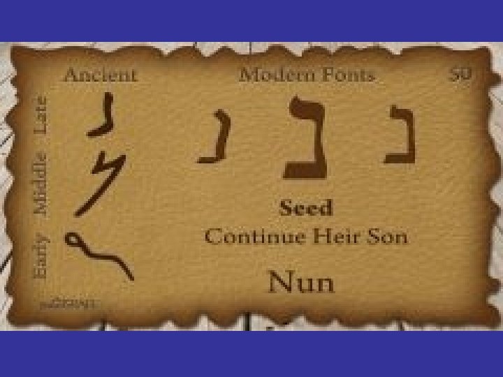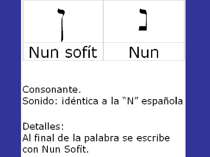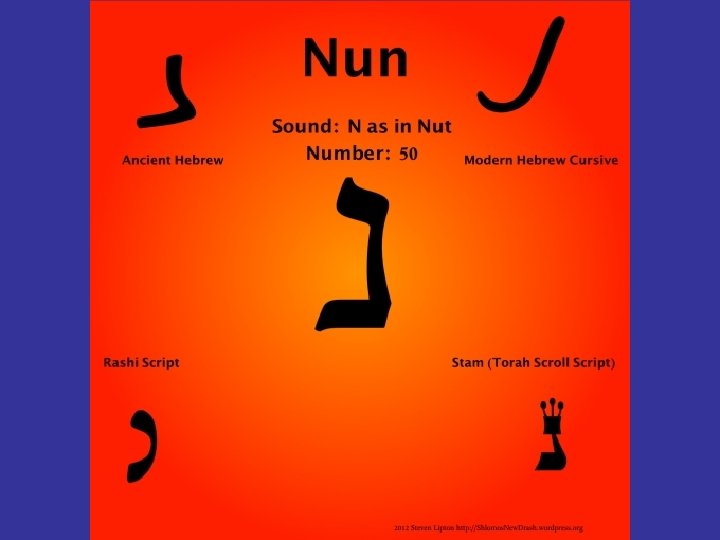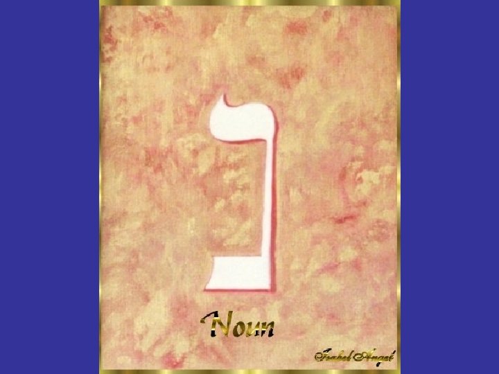 La letra nun • En hebreo, nun significa "reino", y en particular el "heredero del trono". • Nun, entre otros significados, corresponde a la imagen de caer, a la imagen de una caída. • El número 50 la vincula a los 50 Portales de la Luz o el Entendimiento, las 50 puertas de Binah. • Además de su relación con el pez, su forma la asocia a la serpiente (nahash comienza con la letra nun). • Es una letra de “intimidad”, justamente por estar asociada a la reproducción. • También, según el Zohar, tiene un vínculo con la Luna, que tradicionalmente se ha considerado en concordancia con la germinación.