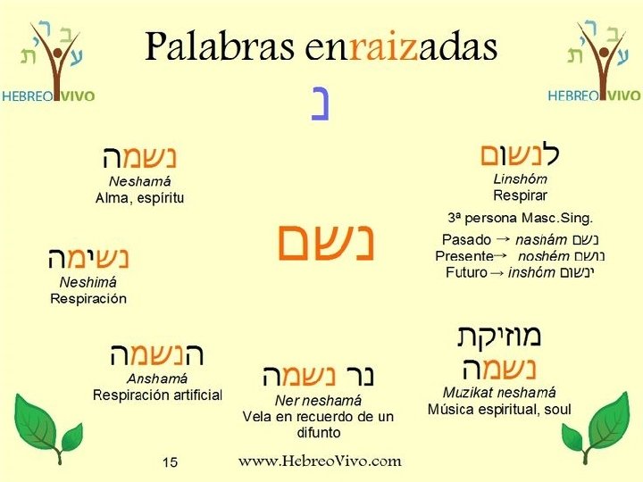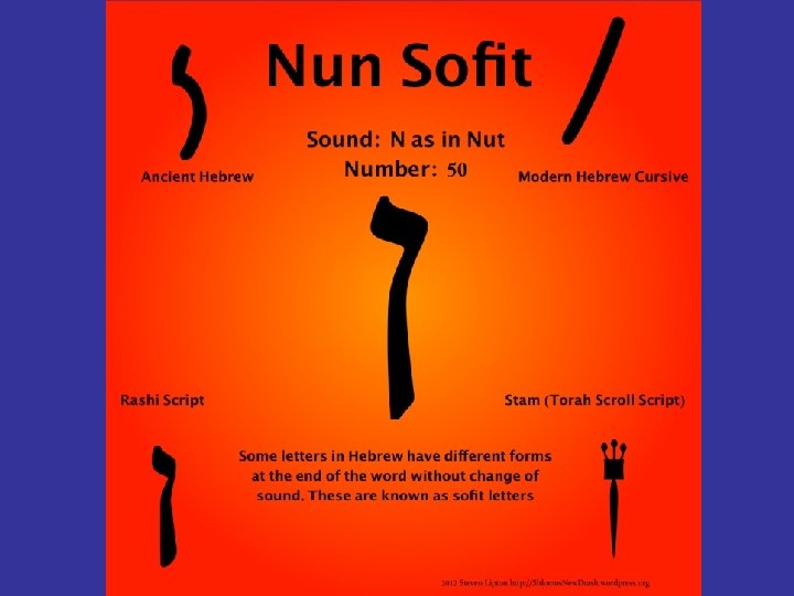 La letra nun • • • La nun también transmite ideas de sucesión, continuidad, herencia. En tal sentido, se la asocia con una semilla, o con un nuevo brote surgido de una planta. Hay dos formas de la nun: la “común” y la “sofit” (al final de la palabra). El valor numérico de la letra es 50, y el de la palabra nun, es 106. Este es también el valor de la palabra que corresponde a línea o eje, y justifica la forma que adquiere la nun sofit.