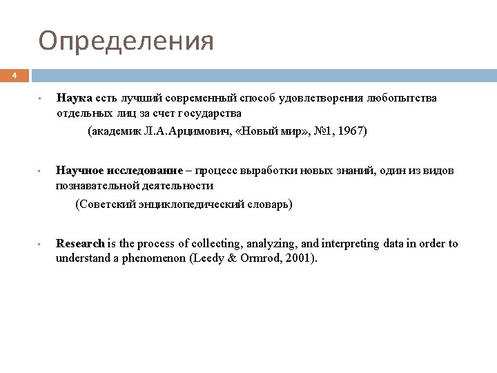Методология научного исследования 14 Research methodology is defined by Leedy & Ormrod (2001) as “the general approach the researcher takes in carrying out the research project” (p. 14). Leedy, P. & Ormrod, J. (2001). Practical research: Planning and design (7 th ed. ). Upper Saddle River, NJ: Merrill Prentice Hall. Thousand Oaks: SAGE Publications. В 2010 г. вышло 9 -е издание