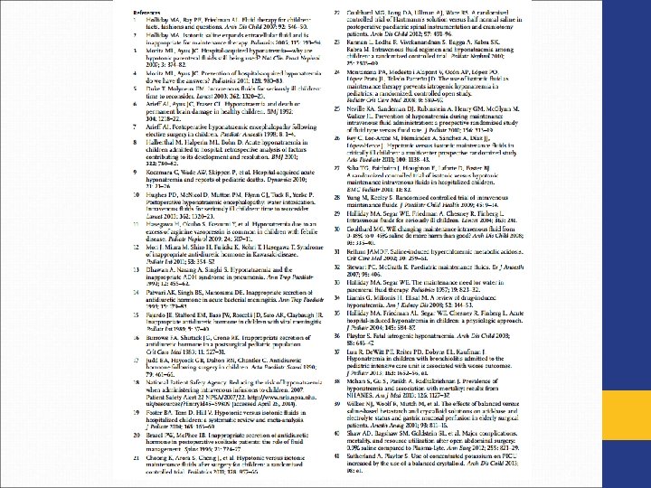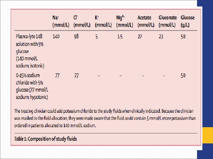 INTRODUÇÃO • O reconhecimento da associação entre hiponatremia e fluidos intravenosos aumentou e algumas autoridades têm recomendado o uso da concentração de sódio de 75 mmol / L em fluidoterapia de manutenção, muito maior do que era anteriormente 18, mas os casos de hiponatremia continuam a ser notados 19. Nos ensaios randomizados de fluidos intravenosos em subpopulações específicas, particularmente aqueles que envolvem pacientes de cuidados pós-operatórios e intensivos tem sugerido que o uso de fluidos isotônicos semelhante a concentração plasmática de sódio pode reduzir o risco de hiponatremia 20 -28. No entanto, evidências de grandes populações heterogêneas de crianças em Hospitais é escassas 19. • Além disso, alguns pesquisadores têm levantado preocupações sobre potenciais efeitos adversos da utilização generalizada de fluidos intravenosos isotônicos, incluindo hipernatremia 29, 30, sobrecarga de líquidos 20 e acidose hiperclorêmica 31 -32.