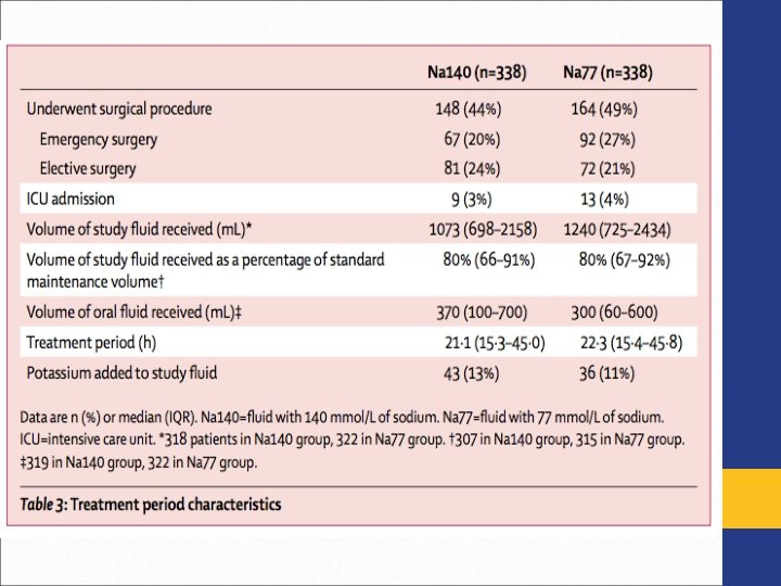 RESULTADOS • As características basais foram semelhantes entre os grupos de tratamento, além de mais crianças menores de 1 ano sendo alocadas para o grupo Na 140 (Tabela 2). Os participantes tiveram uma ampla gama de diagnósticos (apêndice). • Quase metade dos pacientes foram submetidos a uma operação imediatamente antes ou durante o período de tratamento, com números semelhantes de cirurgias eletivas e de emergência presente nos dois grupos (Tabela 3). • O volume de fluido recebido e duração dos períodos de tratamento também foram semelhantes entre os grupos (Tabela 3).