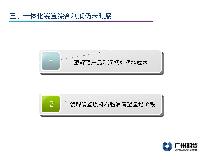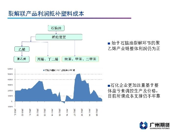 裂解装置的原料石脑油有望量增价跌 1200 CFR日本石�油-布�特 CFR日本石�油 300 250 800 200 600 150 400 100 200 50 0 2010. 26 2010. 11. 26 2010. 12. 26 2011. 1. 26 2011. 2. 26 2011. 3. 26 2011. 4. 26 2011. 5. 26 2011. 6. 26 2011. 7. 26 2011. 8. 26 2011. 9. 26 2011. 10. 26 2011. 12. 26 2012. 1. 26 2012. 2. 26 2012. 3. 26 2012. 4. 26 2012. 5. 26 2012. 6. 26 2012. 7. 26 2012. 8. 26 2012. 9. 26 1000 2500 汽油-石�油价差 ■ 近期亚洲石脑油价格于近年 高位波动,石脑油裂解价差 同处于高位 0 ■柴油、汽油与 石脑油价差回落,后市石脑 油供应有望增加 柴油-石�油价差 2000 1500 1000 500 0 2012. 02 2012. 03 2012. 04 2012. 05 2012. 06 2012. 07 2012. 08 2012. 09 ■ 油价下跌及石脑油供应增加 利于石脑油价格回落,连塑 成本支撑弱化