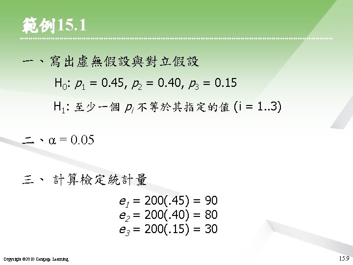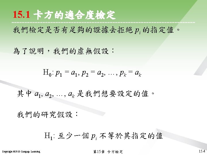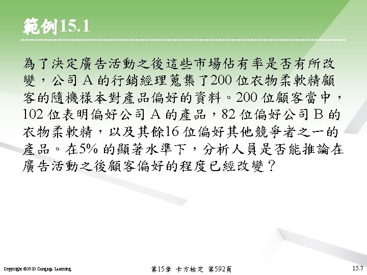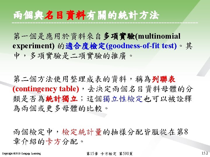 15 1 Copyright 2010 Cengage Learning 15 592 Slides: 36 Download presentation 範例15. 1 四、拒絕域 Copyright © 2010 Cengage Learning 第 15章 卡方檢定 第 592 -593頁 15. 11 Xm 15 -02 Copyright © 2010 Cengage Learning 15. 19 範例15. 2 1. 計算各細格的期望次數: MBA 主修 大學學位 Copyright © 2010 Cengage Learning 會計 財務 行銷 理科 31 24. 08 13 17. 37 16 18. 55 程 8 12. 44 16 8. 97 7 9. 59 商管 12 15. 65 10 11. 29 17 12. 06 其他 10 8. 83 5 6. 37 7 6. 80 第 15章 卡方檢定 第 601 -602頁 15. 27 範例15. 2 手算 2. 計算檢定統計量的值: Copyright © 2010 Cengage Learning 第 15章 卡方檢定 第 601 -602頁 15. 28 範例15. 2 四、拒絕域 2 0. 05, 6 =12. 59 拒絕域 Copyright © 2010 Cengage Learning 第 15章 卡方檢定 第 592 -593頁 15. 29 範例15. 2 電腦軟體 點選Add-Ins、Data Analysis Plus,與Contingency Table(Raw Data)。 Copyright © 2010 Cengage Learning 第 15章 卡方檢定 15. 31