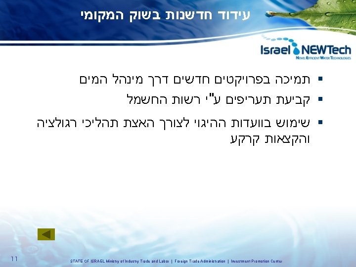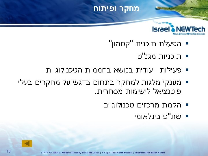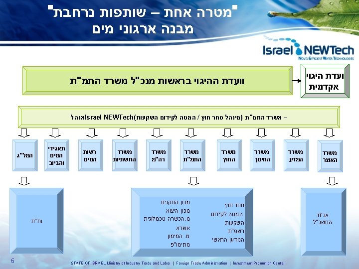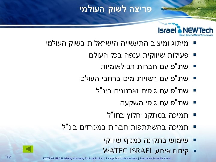 – מים ואנרגיה מנועי הצמיחה של המשק הישראלי ועידת גלובס לעסקים 15. 12. 08 1 STATE OF ISRAEL Ministry of Industry Trade and Labor | Foreign Trade Administration | Investment Promotion Center