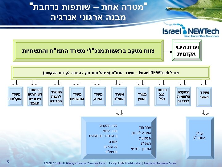 החלטות ממשלה לקידום תעשיות המים והאנרגיה 21/8/08 – Water Tech decision 4 21/8/08 –Energy Tech decision 93 M shekels 350 M shekels / 3 years / 5 years STATE OF ISRAEL Ministry of Industry Trade and Labor | Foreign Trade Administration | Investment Promotion Center