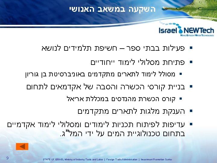 אסטרטגיית התוכנית השקעה במשאב האנושי מחקר הטמעת הפריצה ופיתוח טכנולוגיו ת לשוק בשוק המקומי 7 STATE OF ISRAEL Ministry of Industry Trade and Labor | Foreign Trade Administration | Investment Promotion Center העולמי
