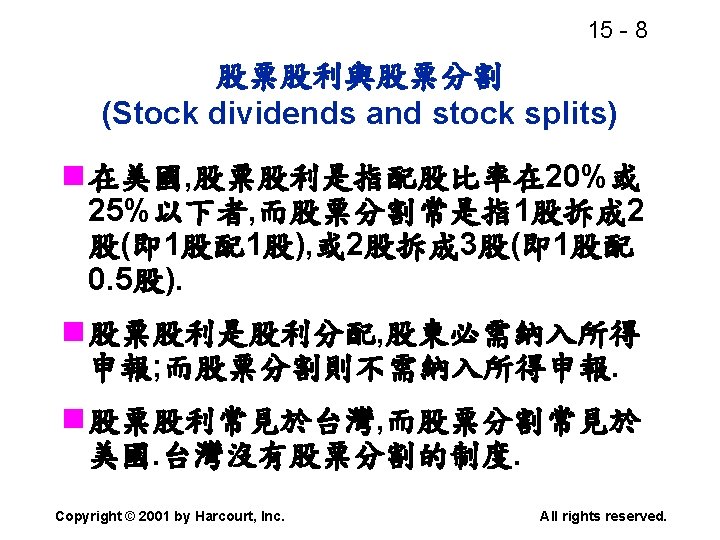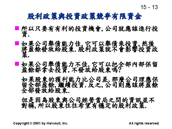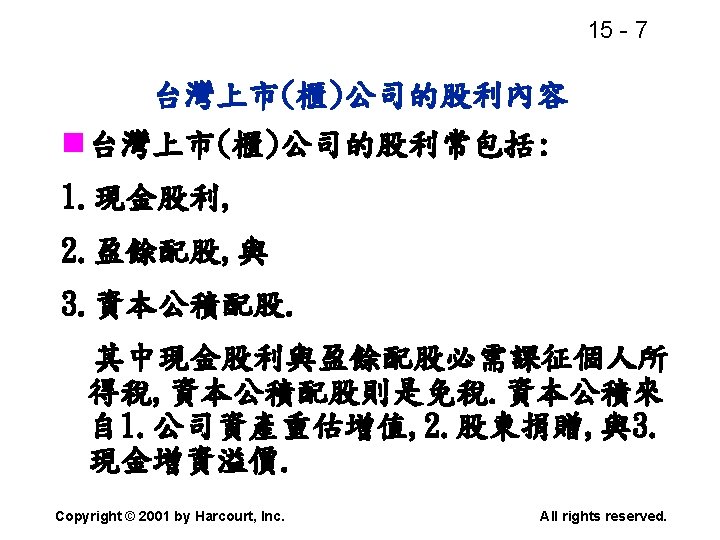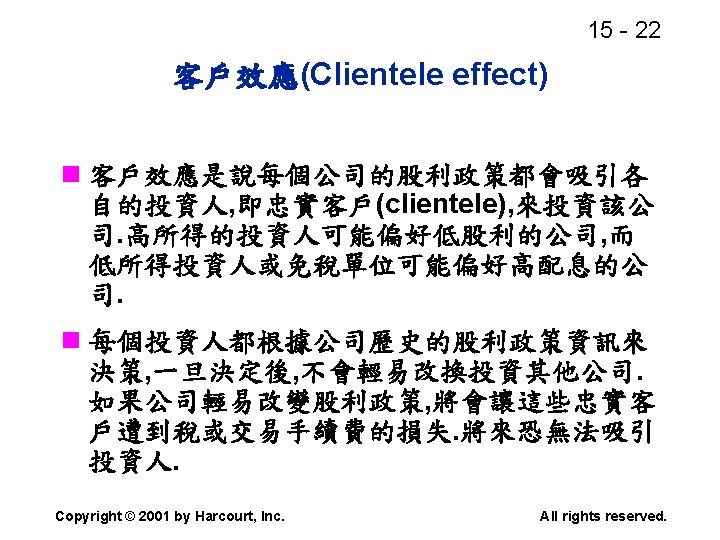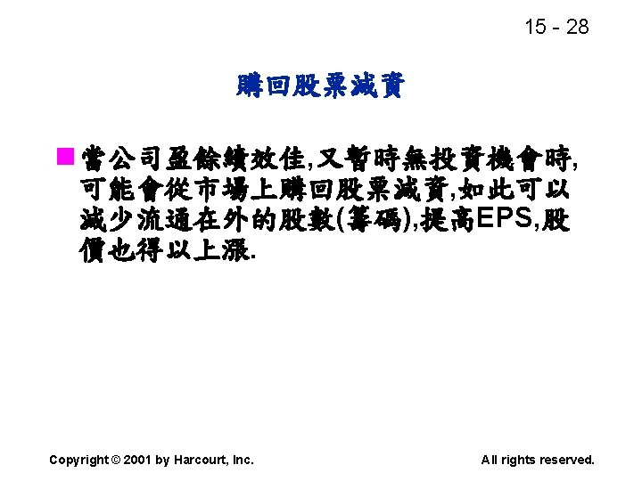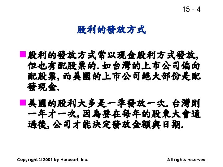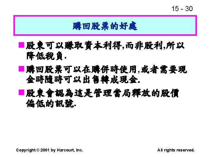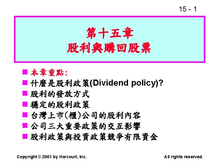 15 2 n n Residual dividend theory n Slides: 32 Download presentation 15 - 2 本章重點: (續) n 股利政策是否會影響股價? n 剩餘股利理論(Residual dividend theory) n 股利訊號(Signalling)假說 n 股票購回(Stock repurchase)的理由 Copyright © 2001 by Harcourt, Inc. All rights reserved. 15 - 23 台灣的兩稅合一制 n 台灣的兩稅合一制是否也是一種客戶效 應(Clientele effect)? Copyright © 2001 by Harcourt, Inc. All rights reserved. 15 - 29 庫藏股 (Treasury stock) n 公司購回股票, 在資產負債表上是列為庫 藏股(Treasury stock), 是流通在外股本 的減項. Copyright © 2001 by Harcourt, Inc. All rights reserved. 15 - 32 美國各產業的股利支付率 產業 股利支付率 Banking 38. 29 Computer Software Services 13. 70 Drug 38. 06 Electric Utilities (Eastern U. S. ) 67. 09 Internet n/a Semiconductors 24. 91 Steel 51. 96 Tobacco 55. 00 Water utilities 67. 35 *參考Brigham and Houston(2001) Copyright © 2001 by Harcourt, Inc. All rights reserved.