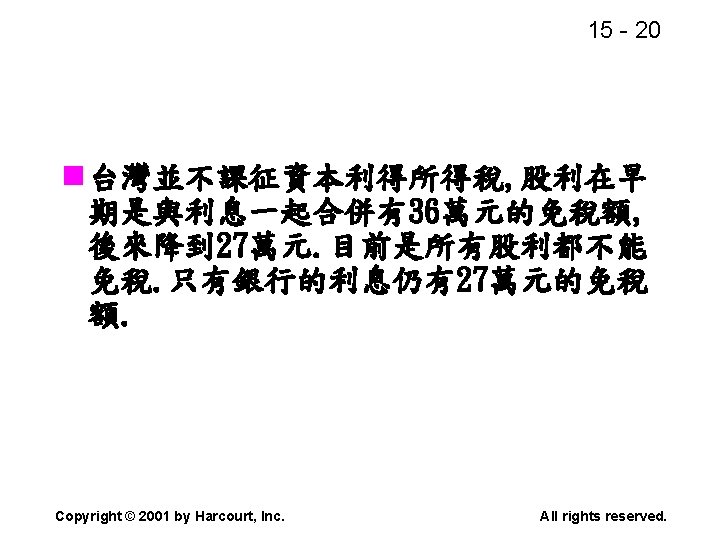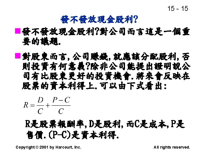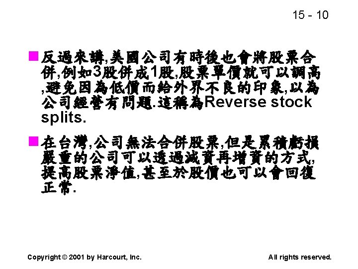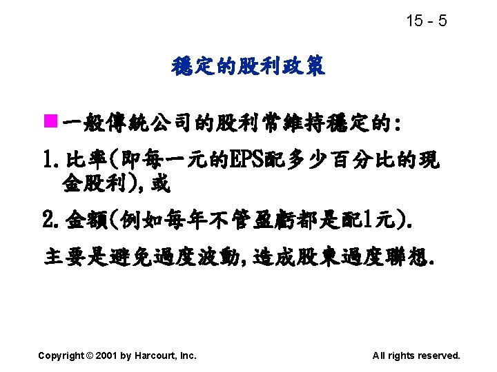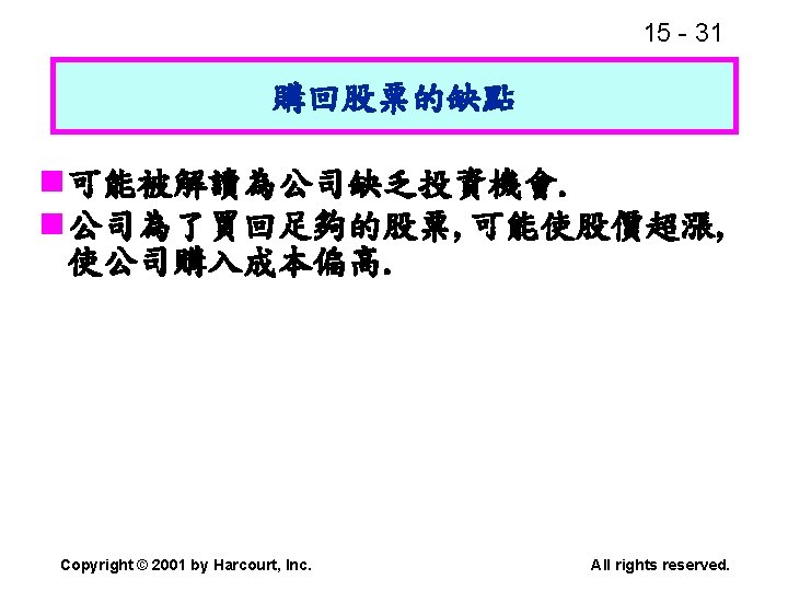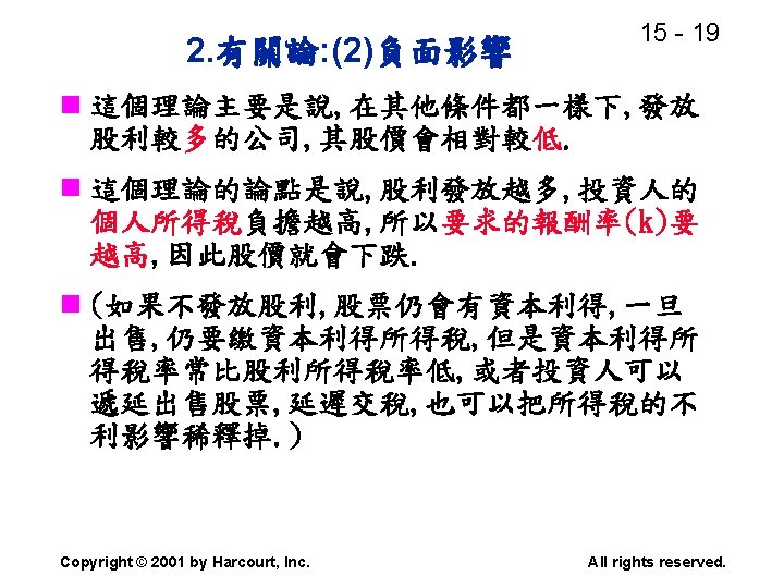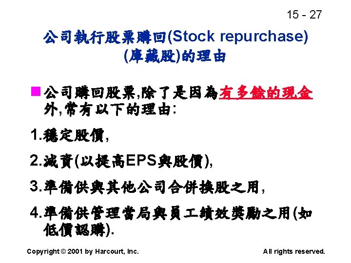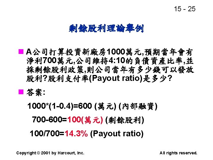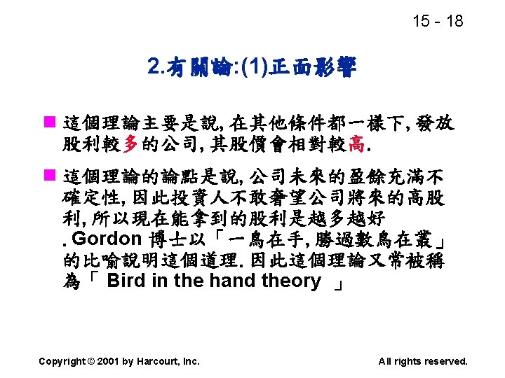 15 2 n n Residual dividend theory n Slides: 32 Download presentation 15 - 2 本章重點: (續) n 股利政策是否會影響股價? n 剩餘股利理論(Residual dividend theory) n 股利訊號(Signalling)假說 n 股票購回(Stock repurchase)的理由 Copyright © 2001 by Harcourt, Inc. All rights reserved. 15 - 23 台灣的兩稅合一制 n 台灣的兩稅合一制是否也是一種客戶效 應(Clientele effect)? Copyright © 2001 by Harcourt, Inc. All rights reserved. 15 - 29 庫藏股 (Treasury stock) n 公司購回股票, 在資產負債表上是列為庫 藏股(Treasury stock), 是流通在外股本 的減項. Copyright © 2001 by Harcourt, Inc. All rights reserved. 15 - 32 美國各產業的股利支付率 產業 股利支付率 Banking 38. 29 Computer Software Services 13. 70 Drug 38. 06 Electric Utilities (Eastern U. S. ) 67. 09 Internet n/a Semiconductors 24. 91 Steel 51. 96 Tobacco 55. 00 Water utilities 67. 35 *參考Brigham and Houston(2001) Copyright © 2001 by Harcourt, Inc. All rights reserved.