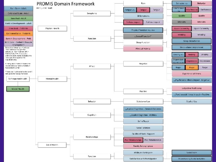 PROMIS Domains in AC, 2010 Domains Emotional Distress – Anger Emotional Distress – Anxiety Emotional Distress – Depression Fatigue # Items Adult Bank 29 # Items Adult # Items Peds Short # Items Short Forms Peds Bank Form 8 6 29 4, 6, 7, 8 15 8 28 4, 6, 8 a, 8 b 14 8 95 4, 6, 7, 8 23 10 Pain – Behavior 39 7 Pain – Interference 41 4, 6 a, 6 b, 8 13 8 Physical Function 124 4, 6, 8, 10, 20 -- Mobility 23 8 -- Upper Extremity 29 8 Asthma Impact 17 8