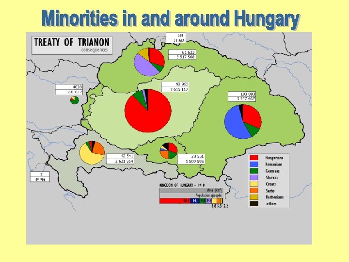 The Treaty of Trianon 1920 • reduced Hungary’s area by two thirds • and the population by one third • considerable Hungarian minorities in the neighbouring countries