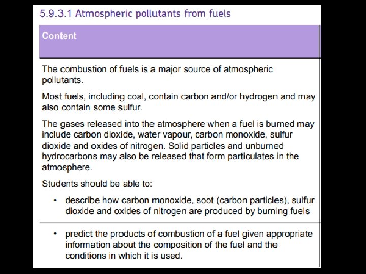 15/12/2020 4. 9. 3 Atmospheric Pollutants and Their Sources Objectives ü Know are the common types of atmospheric pollution? ü Know the consequences of this pollution ü Know the products of complete & incomplete combustion? ü Write word equations for the formation of each pollutant CHALLENGE QUESTION Write balanced symbol equations for the formation of each pollutant.